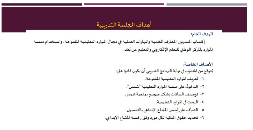 وقد قدمت الدورة الدكتورة سحر عزالدين مشرفة وحدة التعليم الإلكتروني بالكلية، وقد تناولت الدورة التعريف بالموارد التعليمية المفتوحة، والتعرف على رخص المشاع الإبداعي بالتفصيل، والدخول على منصة شمس، وانتهت الدورة بالإجابة على أسئلة عضوات هيئة التدريس وتقديم الشكر لهن على الحضور.