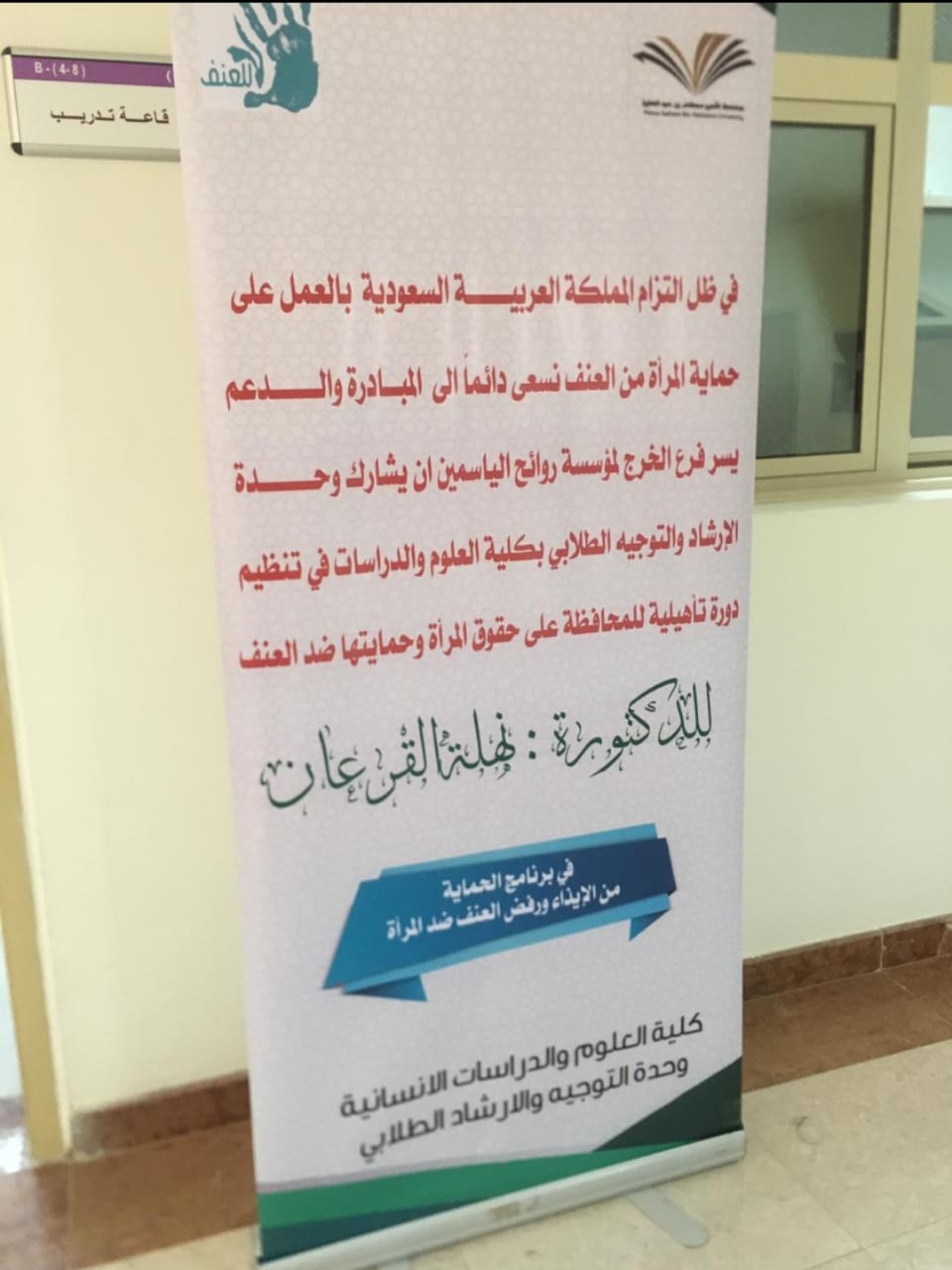 بالتعاون مع وحدة الإرشاد في كلية العلوم والدراسات الإنسانية بالخرج قدّمت رئيسة وحدة التوجيه والإرشاد في عمادة شؤون الطلاب الدكتورة نهله القرعان دورة تدريببة بعنوان