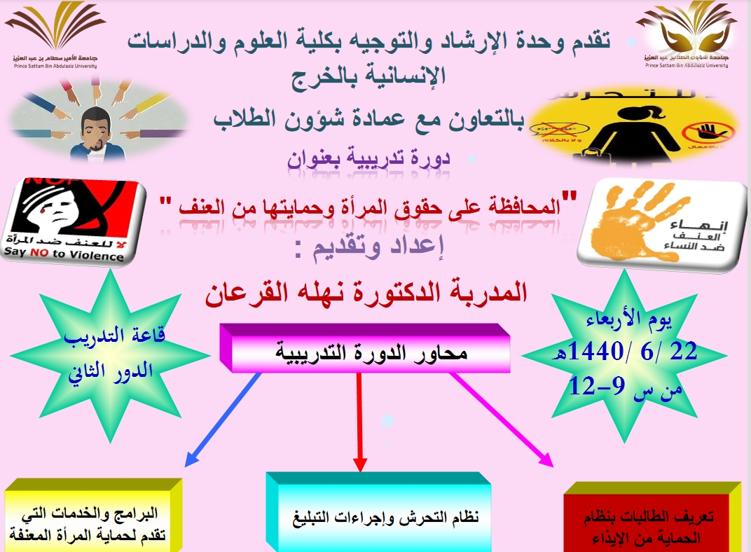 وبدأت الدكتورة نهله بالمحور الأول وتعريف الطالبات بنظام الحماية من الإيذاء الذي اقرته المملكة العربية السعودية حيث تم توزيع نسخ ورقية على الطالبات المشاركات في الدورة للإحتفاظ به والرجوع اليه وقت الحاجة.وبعدها بدأت بالمحور الثاني وهو نظام التحرش وإجراءات التبليغ حيث أنه موضوع اجرامي لا يمكن الاستهانة به والسكوت عنه في أي حال من الأحوال.
