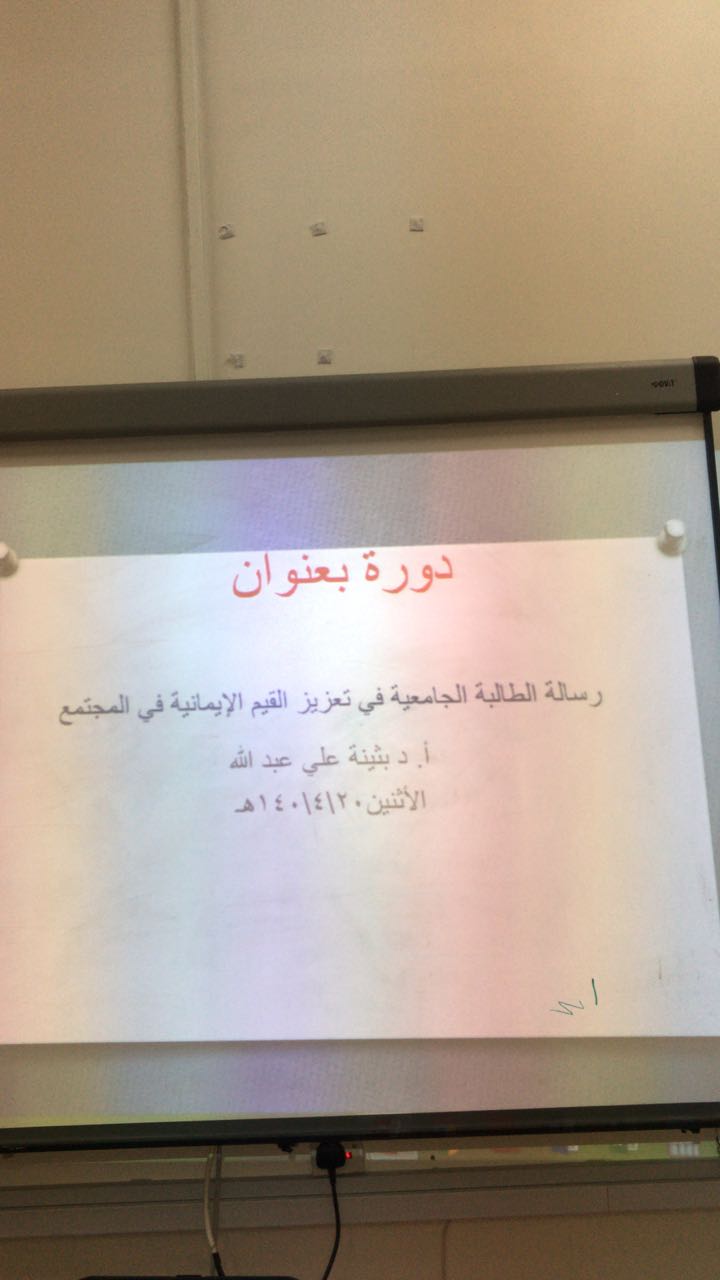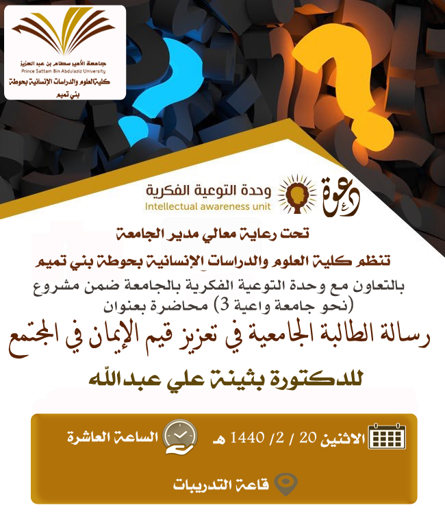 ضمن مشروع نحو جامعة واعية ٣ وبرعاية عميدة الكلية الدكتورة حصة بنت سعود الهزاني، نظمت كلية العلوم والدراسات الانسانية بحوطة بني تميم محاضرة بعنوان (رسالة الطالبة الجامعية في تعزيز قيم الايمان في المجتمع). قدمت المحاضرة الدكتورة بثينة على عبدالله وذلك يوم الاثنين الموافق 20 / 2/ 1440 هـ الساعة العاشرة صباحاً بإشراف منسقة الكلية للتوعية الفكرية الأستاذة فوزية الجمعة وبحضور عدد ١٦ طالبة. كان من أبرز اهداف الدورة تعزيز القيم الايمانية لدى الطالبة وتوعية المجتمع وتجريده من افكار التطرف والانحراف الفكري والتمسك بمنهج الكتاب والسنة.