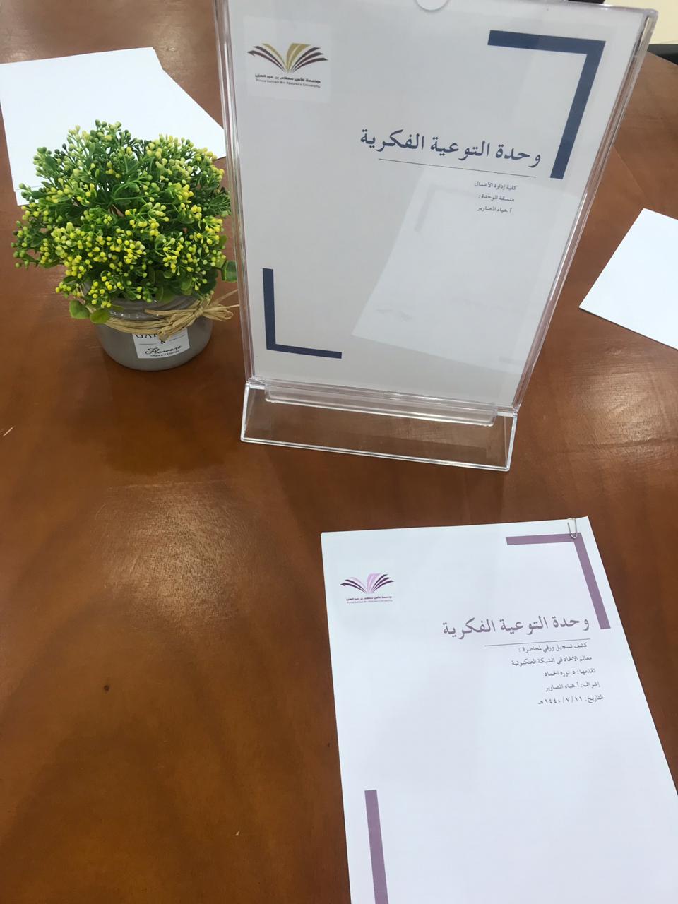 نظمت وحدة التوعية الفكرية في كلية إدارة الأعمال بالخرج يوم الاثنين الموافق 11/ 7/ 1440هـ بإشراف أ. هياء المصارير حلقة نقاش بعنوان معالم الإلحاد في الشبكة العنكبوتية من الساعة العاشرة حتى الثانية عشر صباحاً، قدمتها د. نورة الحماد بحضور كوكبة من طالبات الكلية ومجموعة من أعضاء هيئة التدريس والإداريات، وتناولت في مقدمتها الدكتورة نورة تعريف الإلحاد ثم تطرقت إلى أنواعه وأسباب ظهوره في العالم العربي والغربي.