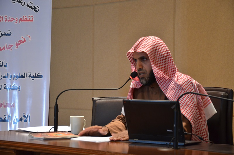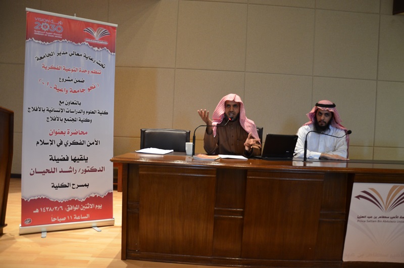 نظمت وحدة التوعية الفكرية ضمن مشروع ( نحو جامعة واعية -1- ) بالتعاون مع كلية العلوم والدراسات الإنسانية والمجتمع بالأفلاج - برعاية معالي مدير الجامعة الدكتور عبد الرحمن بن محمد العاصمي وبإشراف المشرف على كليات الجامعة في الأفلاج الدكتور مسفر بن محماس الكبيري - محاضرة بعنوان ( الأمن الفكري ) في الإسلام والتي قدمها الدكتور/ راشد بن محسن آل لحيان أمس الاثنين الموافق 1438/3/6هـ وحضر المحاضرة عدد من طلاب كليات الأفلاج بالإضافة لعدد من أعضاء هيئة التدريس.