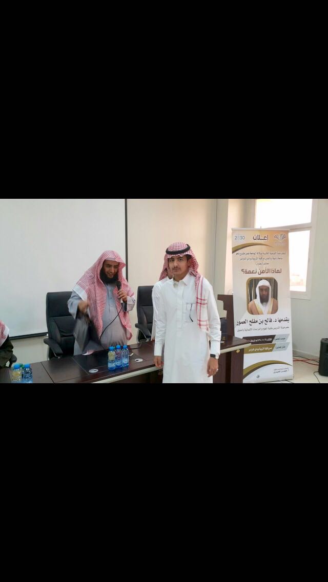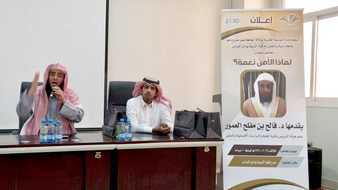 أقامت وحدة التوعية الفكرية بجامعة الأمير سطام بن عبدالعزيز بالتعاون مع كلية التربية بوادي الدواسر محاضرة بعنوان ( لماذا الأمن نعمه ) قدمها الدكتور مفلح بن فالح العمور عضو هيئة التدريس بكلية العلوم والدراسات الإنسانية بالسليل وذلك بمسرح الكلية .