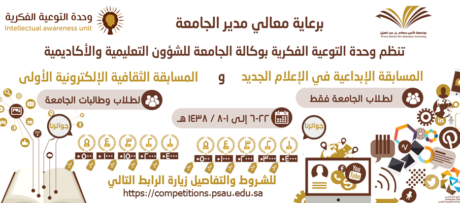 برعاية معالي مدير الجامعة الدكتور عبدالرحمن بن محمد العاصمي أطلقت وحدة التوعية الفكرية بوكالة الجامعة للشؤون التعليمية والأكاديمية أولى مسابقاتها هي المسابقة الإبداعية في الإعلام الجديد وهي خاصة بطلاب الجامعة فقط , وكذلك المسابقة الثقافية الالكترونية الأولى لطلاب وطالبات الجامعة خلال الفترة 22 / 6 – 1 / 8 / 1438هـ , بإجمالي جوائز أكثر من 20ألف ريال , خصصت لأول خمسة مراكز من كل مسابقة.