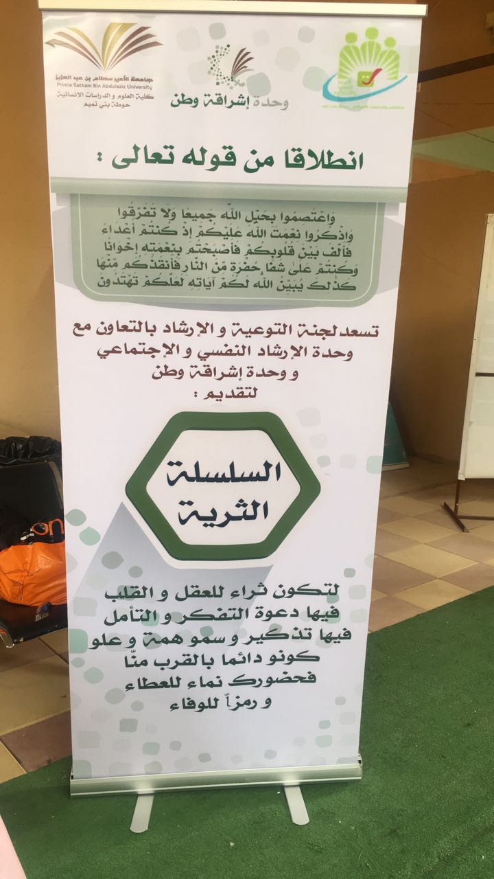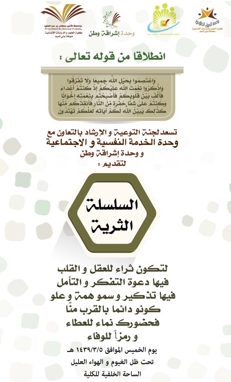 في جو غائم وزخات مطر عليلة وفِي رحاب ساحة الحرم الجامعي وتحت قيادة عميدة كلية العلوم والدراسات الإنسانية بحوطة بني تميم الدكتورة حصة بنت سعود الهزاني، تألقت وحدة إشراقة وطن بجلسة ودية مع الطالبات وأعضاء هيئة التدريس ومنسوبات الكلية من الطاقم الإداري بأسلوب شيق وجذاب لتنمية حب الأنشطة وتقبلها والتفاعل والإنضمام لها ممتداً بالتعاون مع لجنة التوعية والإرشاد ووحدة الخدمة النفسية والاجتماعية. حيث تم إعداد أركان من قبل الطالبات بعنوان السلسلة الثرية انقياداً لقول الله تعالى: (واعتصموا بحبل الله جميعاً)، قام الطالبات من خلالها بالتعريف لمواضيع عدة تندرج تحت هذه الآية. وقد لاقى البرنامج تفاعلاً قوياً من قبل الطالبات وتم إقامة مسابقات ومشاركات أضفت الفرحة والسرور على الجميع.