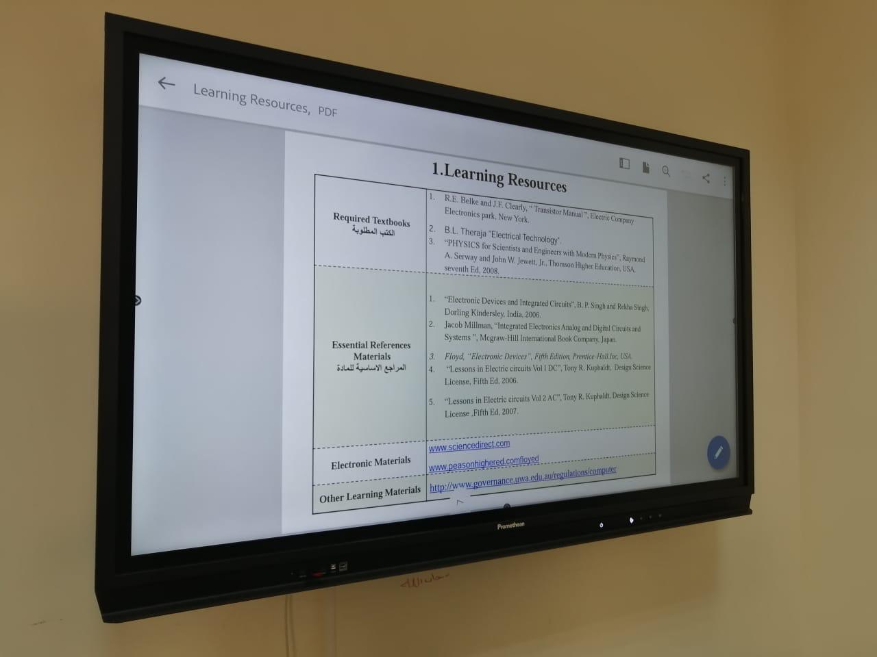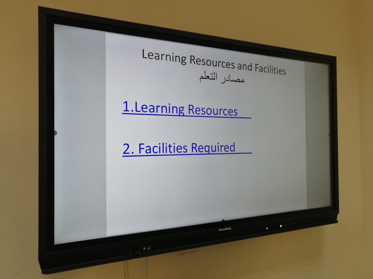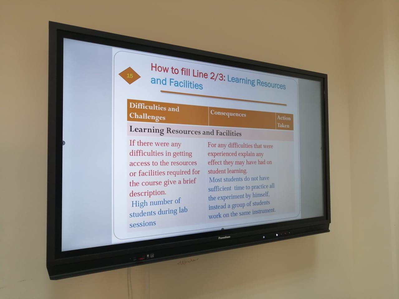 ركزت الورشة أيضًا على كيفية كتابة تقرير كامل للقسم السادس الموجود في توصيف المقرر الدراسي، والمتعلق بجزء "موارد التعلم" و "المرافق التعليمية" والتي بدورها تعكس جزئية "الصعوبات والتحديات" الواردة في تقرير المقرر الدراسي.