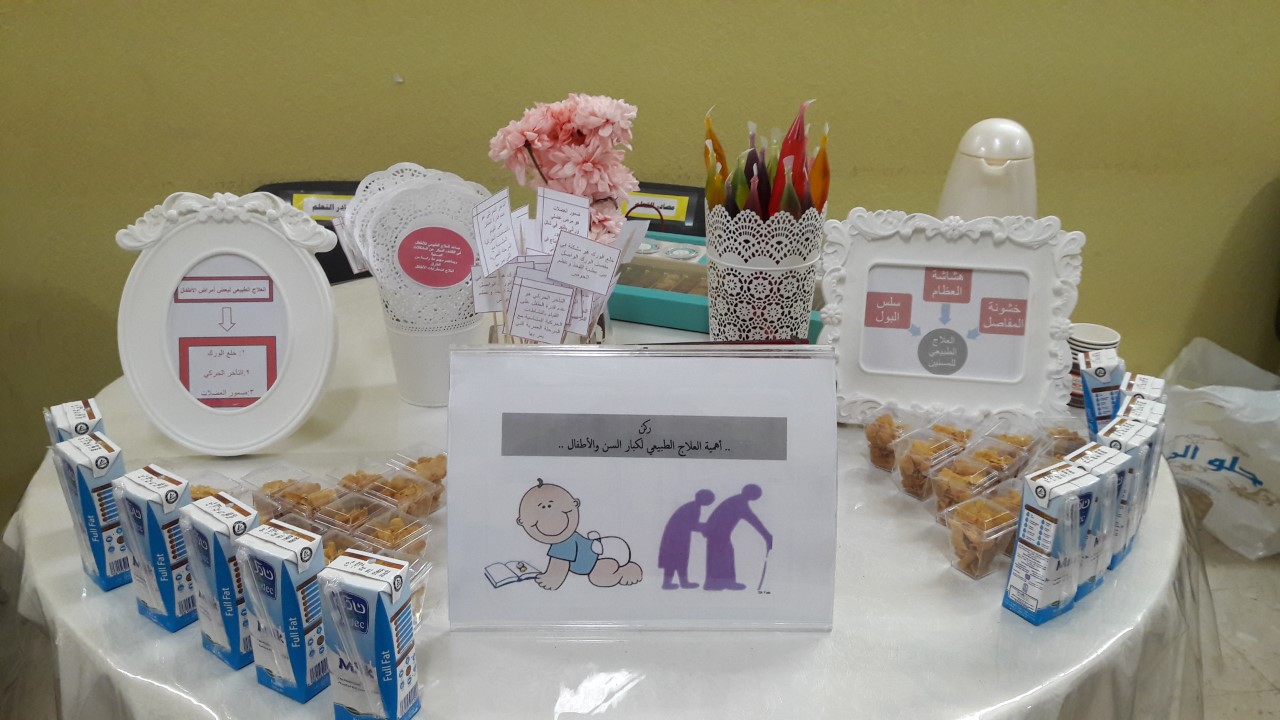 قامت طالبات كلية العلوم الطبية التطبيقية ضمن الخدمات المقدمة من وحدة خدمة المجتمع بالكلية للتوعية والتثقيف الصحي للمجتمع فعالية بعنوان :أهمية العلاج الطبيعي في مدرسة ثانوية ومتوسطة النخبة الأهلية تحت إشراف د/حميرا عبدالرب وذلك يوم الأحد الموافق 3/26/ 1438هـ . واشتملت الفعالية على عدة أركان أهمها: (ركن التعريف بالعلاج الطبيعي وركن أهمية العلاج الطبيعي للرياضيين , وأخر لكبار السن والأطفال وركن أهمية العلاج الطبيعي للأمراض العصبية )