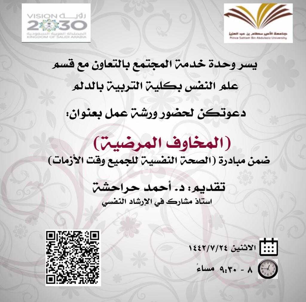وفي يوم الاثنين نُفذت ورشة بعنوان "المخاوف المرضية" ضمن مبادرة (الصحة النفسية للجميع وقت الازمات) من اعداد وتقديم الدكتور/احمد حراحشة-أستاذ مشارك في الارشاد النفسي بقسم علم نفس- ويهدف الى: التعرف على مفهوم المخاوف المرضية (الفوبيا) – أسبابها، أنواعها، سماتها، الفرق بين الخوف المرضي والخوف العادي وطرق الوقاية والعلاج منها.