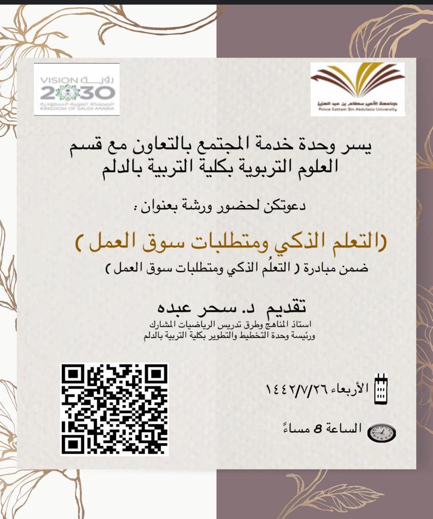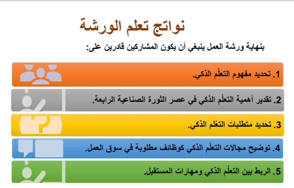 أما في يوم الاربعاء نُفذت ورشة بعنوان "التعلم الذكي ومتطلبات سوق العمل "ضمن مبادرة (التعلم الذكي ومتطلبات سوق العمل) من اعداد وتقديم الدكتورة/سحر عبده-رئيسة وحدة التخطيط والتطوير بالكلية- وتهدف الى: تحديد مفهوم التعلُم الذكي وأهميته في عصر الثورة الصناعية الرابعة بالقرن الحادي والعشرين وتحديد متطلباته ومجالاته كوظائف مطلوبة في سوق العمل والربط بين التعلُم الذكي ومهارات المستقبل.
