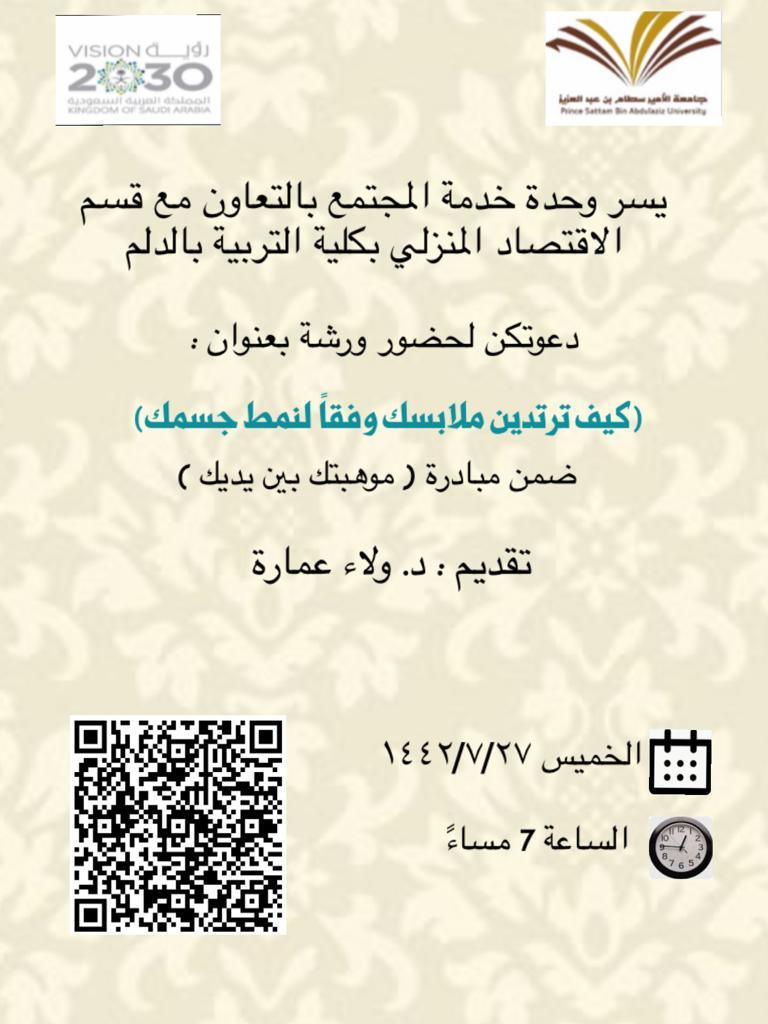نظمت وحدة خدمة المجتمع بالكلية تحت اشراف الأستاذة/نورة التميمي بالتعاون مع الأقسام التعليمية عددً من الورش التدريبية استهدفت منسوبات الكلية وربات البيوت والمهتمات، عبر منتدى الكلية على البلاك بورد.