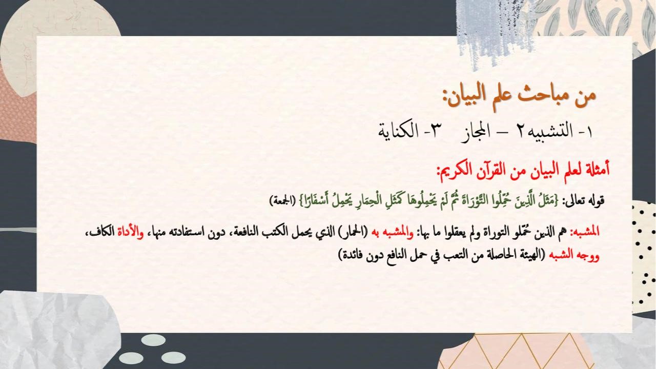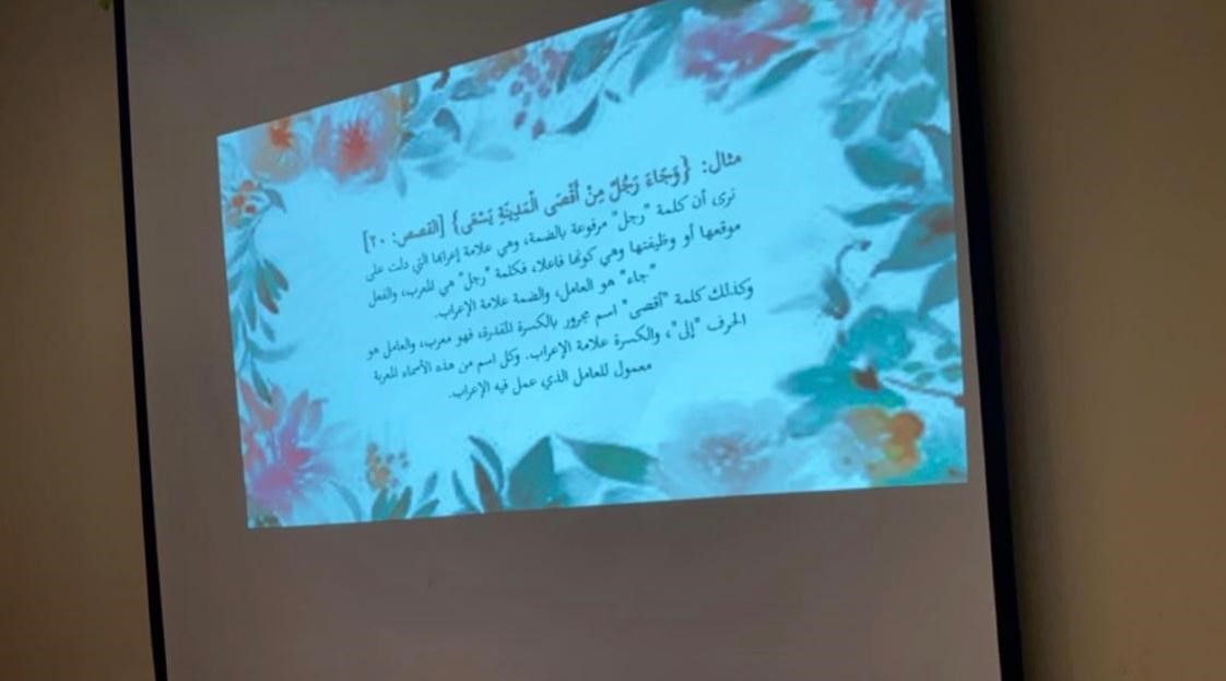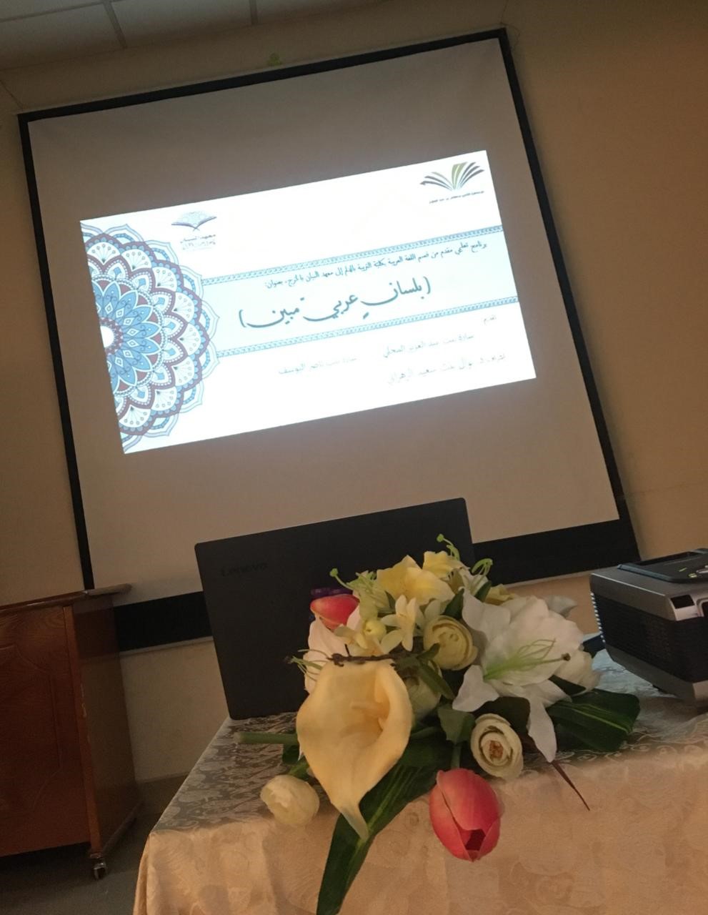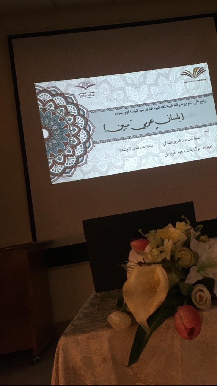 نظمت وحدة خدمة المجتمع بالتعاون مع قسم اللغة العربية بالكلية برنامجًا بعنوان (بلسان عربي مبين) في معهد البيان بالخرج استهدف فيه طالبات ومنسوبات المعهد وعلى مدى ثلاثة أيام ابتداءً بيوم الثلاثاء الموافق :26/5/1441هـ صباحًا وكان المحور الأساسي هو (القرآن وعلاقته بالعلوم العربية ومنها علم النحو) أما يوم الأربعاء فكان المحور الأساسي (القرآن وعلاقته بعلم الصرف والمعاجم الدلالية) ويوم الخميس كان المحور الأساسي (القرآن الكريم وعلاقته بالبلاغة) تناول فيها جزأين من القرآن يتخللها فترة الاستراحة.