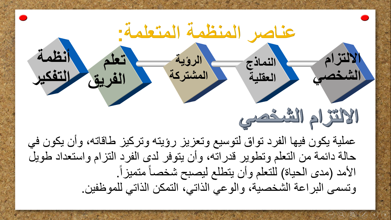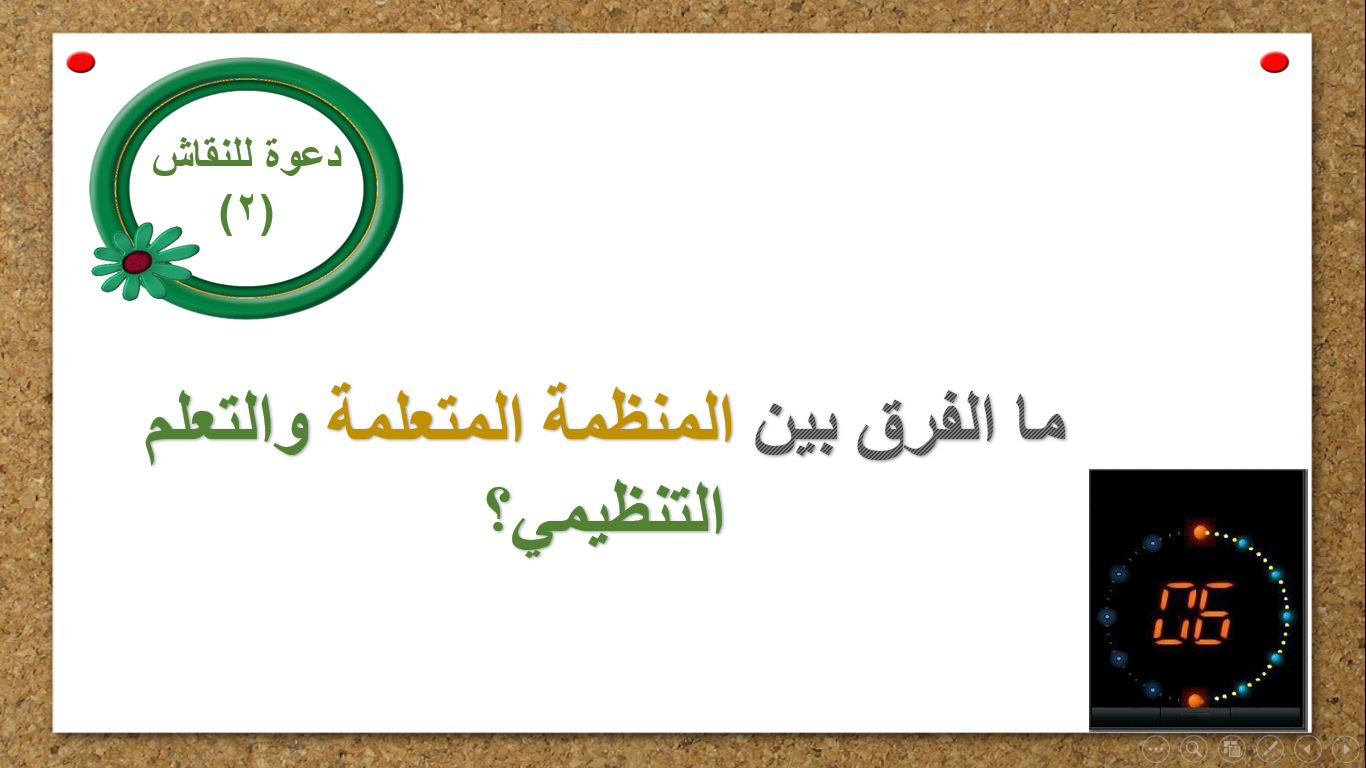 - المنظمة المتعلمة كمدخل للتطوير التنظيمي والفرق بين التعلم التنظيمي والمنظمة المتعلمة.