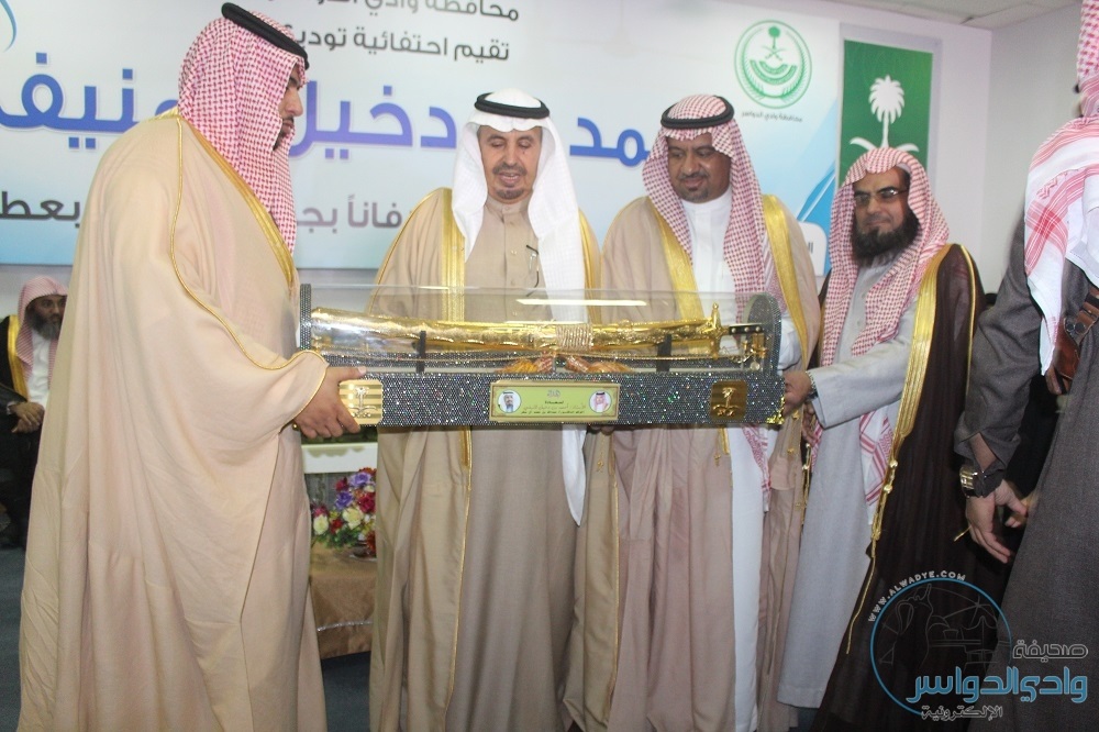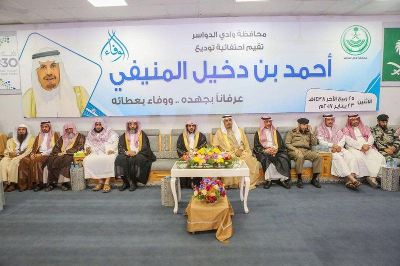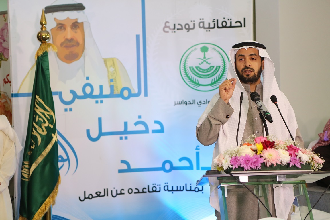 وحرص صاحب مبادرة التكريم وكيل محافظة وادي الدواسر، أحمد بن سعيد العلم ، على الاحتفاء بما قدمه "المنيفي"، وإسهاماته المتعددة بما يحقق طموحات ولاة الأمر، وآمال وتطلعات مواطني المحافظة في تلبية حاجاتهم، ومعالجهم همومهم وقضاياهم التي امتدت على مدى 6 سنوات.
