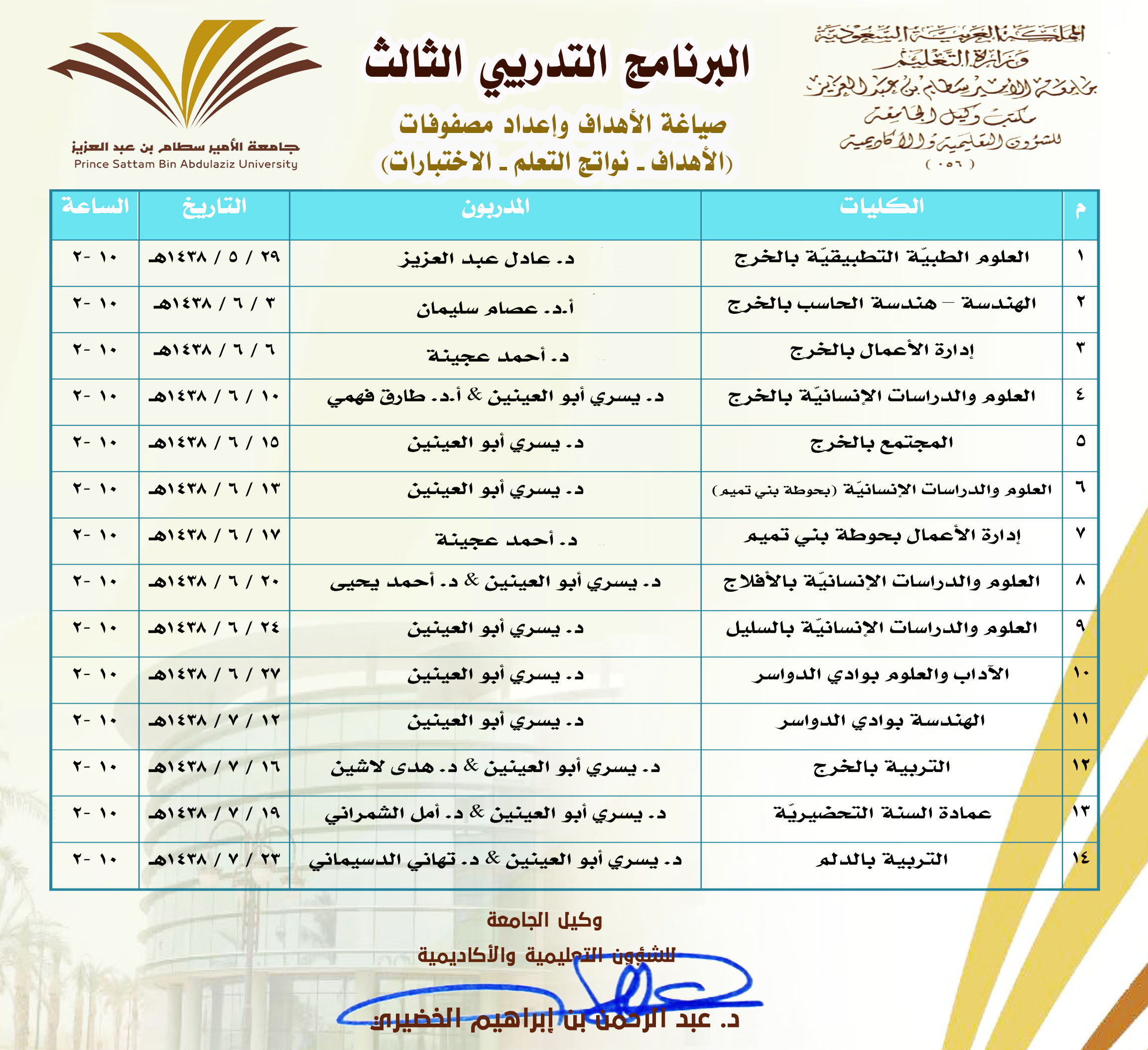 وبتوجيه وكيل الجامعة للشؤون التعليمية والأكاديمية الدكتور عبد الرحمن الخضيري، وحرصه على متابعة مستوى التحسن والنمو في أداء منسوبي الجامعة من أعضاء هيئة التدريس استمرارًا في تنفيذ رسالة الجامعة لتأهيل خريجيها القادرين على المنافسة في سوق العمل وفق رؤيتها نحو التميز في التعليم والشراكة المجتمعية. مشيرًا إلى أن هذا البرنامج أحد الخطوات في توجهنا الجديد نحو تطبيق أفضل الممارسات العالمية في بناء برامج أكاديمية أفضل لوطننا. ولأجل تحقيق آمالنا وتطلعاتنا، وقد بدأنا بالفعل بتنفيذ عدد من البرامج التدريبية التي أسهمت ومهدّت الطريق أمام بناء مخرجات تعليمية تتناسب وتحقيق معايير القياس والتقويم؛ وسوف تسعى جامعة الأمير سطّام بن عبد العزيز إلى الدفع بهذا الاتجاه والاهتمام بتطوير مخرجات البرامج الأكاديمية، وتطبيق النظم التعليمية التي تدفع عجلة الاقتصاد والتنمية.