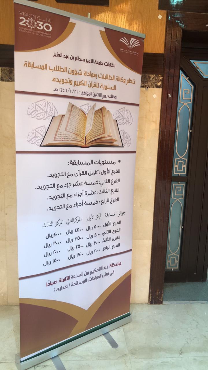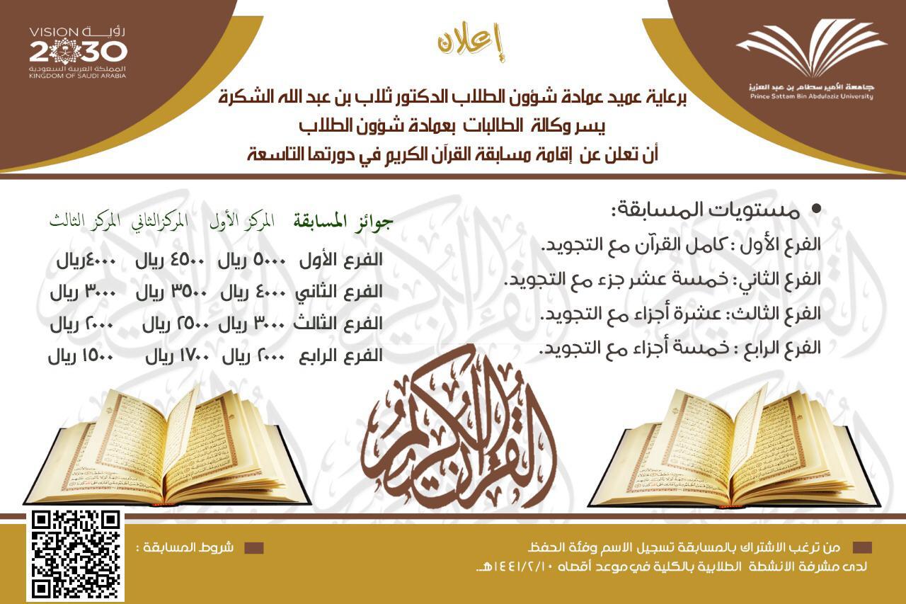 برعاية عميد شؤون الطلاب الدكتور ثلاب بن عبد الله الشكرة وتحت إشراف وكيلة عمادة شؤون الطلاب الدكتورة دلال المطرفي أقامت وكالة الطالبات بعمادة شؤون الطلاب المسابقة السنوية التاسعة لحفظ القرآن الكريم وتجويده، أقيمت المسابقة في مسرح مبنى هداية وقد تم ترشيح ٢٧ طالبة للتنافس في مستويات المسابقة : الفرع الأول كامل القرآن مع التجويد ، الفرع الثاني خمسة عشر جزء مع التجويد ،