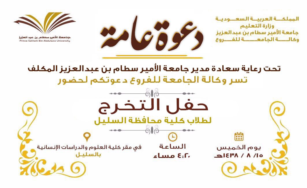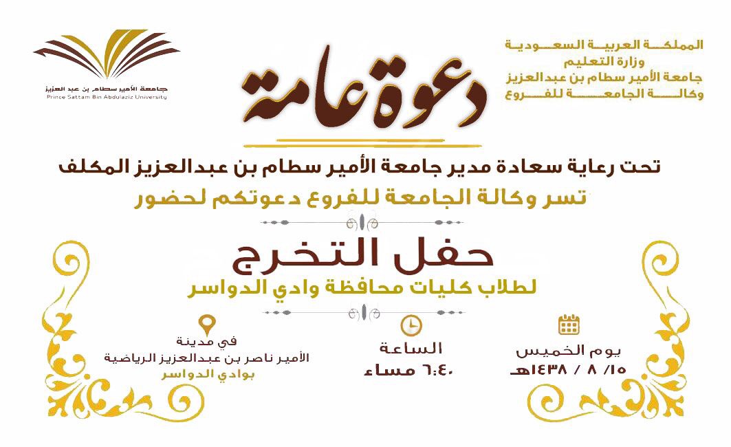 embed">تحتفي وكالة جامعة الأمير سطّام بن عبدالعزيز للفروع بمحافظتي وادي الدواسر والسليل ، غدًا الخميس بتخريج الدفعة السابعة من طلاب كليات وادي الدواسر، وتخريج الدفعة الرابعة من طلاب كلية السليل ، خلال احتفالية تقيمها بحضور مدير الجامعة المكلف الدكتور عبدالعزيز بن عبدالله الحامد ، في محافظتي وادي الدواسر والسليل .