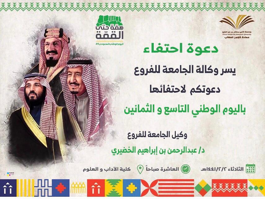 تحتفي وكالة جامعة الأمير سطام بن عبدالعزيز للفروع بوادي الدواسر يوم غدٍ الثلاثاء الموافق 1441/2/2هـ في تمام الساعة العاشرة صباحا، باليوم الوطني التاسع والثمانين للمملكة تحت شعار " همة حتى القمة " ، بحضور محافظ وادي الدواسر الأستاذ عبدالله بن سليمان المبارك ، وذلك بمقر المدينة الجامعية بالمحافظة بمبني كلية الآداب والعلوم .