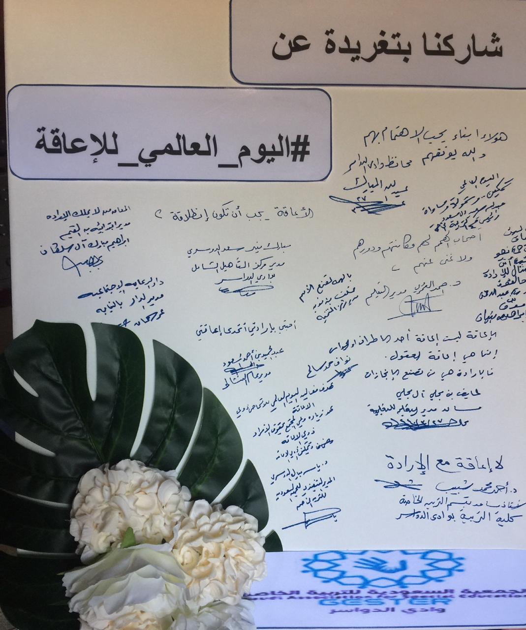 حيث افتتح محافظ وادي الدواسر المعرض المصاحب والذي اشتمل على أركان للجمعية السعودية للتربية الخاصة – جستر- ومركز التأهيل الشامل والمستشفى العام وجامعة الأمير سطام بن عبد العزيز ولجنة التنمية الأهلية بالقويز ، وفصول التربية الفكرية بعدد من المدارس.