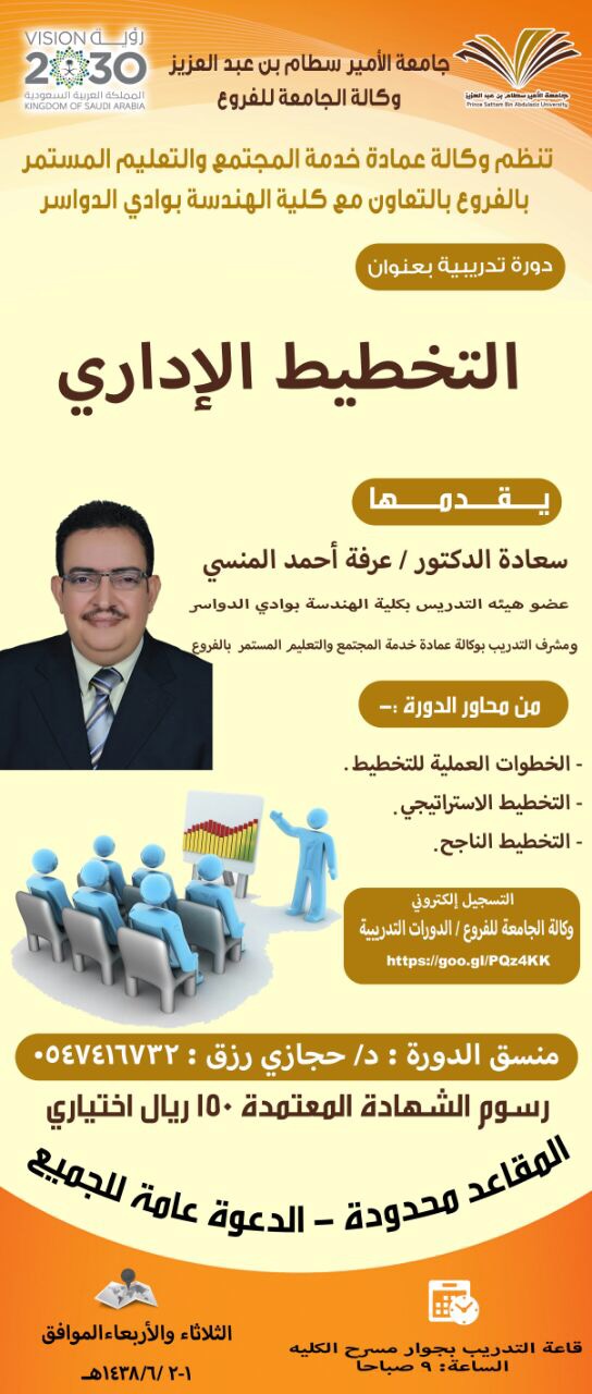 تنظم وكالة عمادة خدمة المجتمع والتعليم المستمر بوكالة جامعة الأمير سطام بن عبدالعزيز للفروع بوادي الدواسر والسليل ،وبالتعاون مع كلية الهندسة بوادي الدواسر يومي الثلاثاء والاربعاء الموافق ١-٢ /٦/ ١٤٣٨هـ في تمام الساعة ٩ صباحا في قاعة التدريب بكلية الهندسة دورة تدريبية في «التخطيط الاداري» يقدمها الدكتور / عرفة أحمد المنسي عضو هيئة التدريس بكلية الهندسة ومشرف التدريب بوكالة عمادة خدمة المجتمع والتعليم المستمر بالفروع .