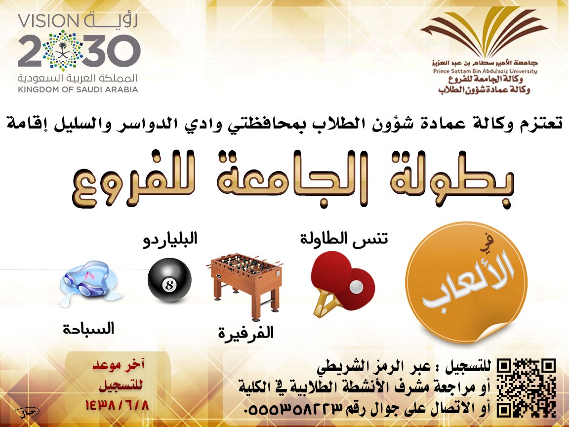 يسر وكالة عمادة شؤون الطلاب بالفروع أن تعلن عن بدء التسجيل لبطولة الجامعة للفروع لطلاب كليات وادي الدواسر والسليل في الألعاب التالية: ( تنس الطاولة - الفرفيرة - البلياردو - السباحة )