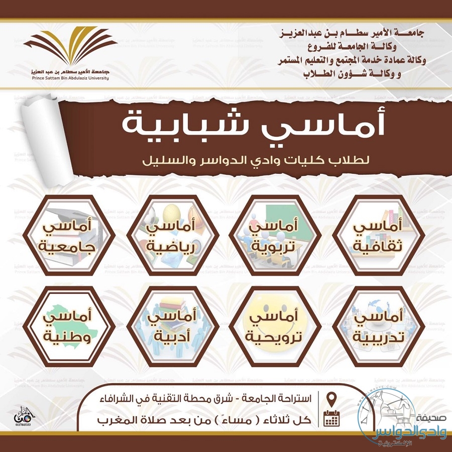 أطلقت وكالة عمادة شؤون الطلاب بالفروع بجامعة الأمير سطام بن عبدالعزيز ملتقى “أماسي شبابية” والذي يستهدف طلاب كليات وادي الدواسر والسليل ، وذلك لتعزيز مفهوم المواطنة لديهم وصقل مهارات التفكير والبحث.
