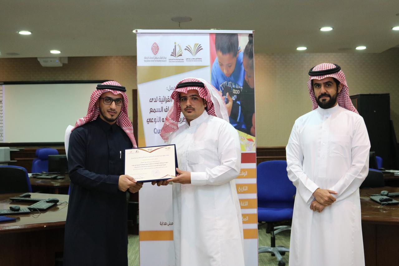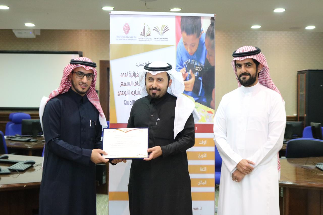 من جانبه قدم الدكتور فيصل بن محمد القريني وكيل معهد البحوث والخدمات الاستشاريّة للبرامج والدراسات والبحوث شكره لمركز الملك سلمان لأبحاث الإعاقة مشيرًا إلى أن هذه الورشة تأتي ضمن الشراكة الاستراتيجيّة القائمة بين جامعة الأمير سطام بن عبد العزيز والمركز في سعيهما إلى التعاون لتطوير الخبرات والكفاءات في مجال الأبحاث الخاصة بالإعاقة، والعمل على إثراء المعرفة في مجال الوقاية والرعاية المتعددة، كما قدم -في السياق نفسه- شكره سعادة الدكتور خالد بن ناصر العاصم، على تقديمه هذه الورشة التي تضمنت فهم ومعرفة المكونات الأساسيّة لعملية القراءة، معرفة الفترة الحرجة لعملية القراءة، تحديد سبب التأخر القرائي لدى الطلاب الصمّ وضعاف السمع، تطبيق الاستراتيجيات المناسبة لحل المشكلات القرائية للطلاب الصمّ وضعاف السمع.