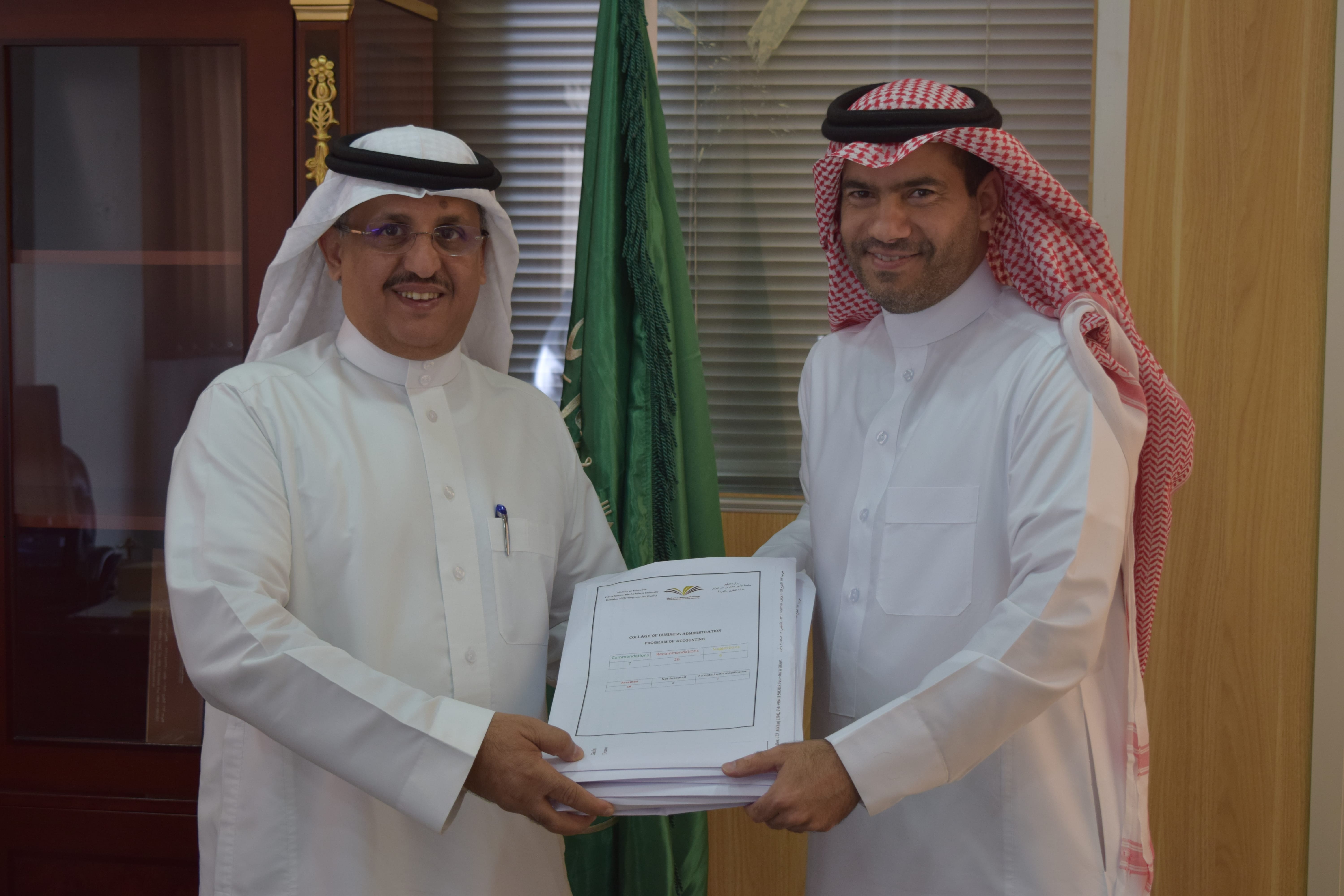 تسلم وكيل الجامعة للتطوير والجودة الدكتور/ ناصر القحطاني الخطط التنفيذية لتحسين جودة الأداء بالبرامج الأكاديمية المشاركة في مشروع التقويم التطويري، وأثنى سعادته على الجهد المبذول من قبل عمادة التطوير والجودة والبرامج المعنية في رفع مستوى جودة الأداء مما يسهم في تحقيق رسالة واهداف جامعتنا. ومن جانبه فقد أوضح عميد التطوير والجودة سعادة الدكتور/ فهد السهلي أن العمادة عكفت على تهيئة البرامج الاكاديمية المشاركة في مشروع التقويم التطويري من خلال الكثير من اللقاءات بين منسوبي تلك البرامج وبين مستشاري العمادة مما ساعد على بناء خطط تنفيذية بشكل احترافي لتتسق مع التوصيات الواردة. وبعد ان أتمت البرامج المعنية إعداد خططها التنفيذية، قام مستشاري العمادة بمراجعة الخطط المعدة للتأكد من مدى توافقها مع التوصيات الواردة وتحقيقها الهدف المنشود بتحسين جودة الأداء داخل تلك البرامج. ومن ثم تمت مناقشة مرئيات ومقترحات مستشاري العمادة حول جودة تلك الخطط التنفيذية بلقاء وفد من العمادة يترأسه سعادة الدكتور/ فهد السهلي مع مسؤولي البرامج المعنية من عمداء ووكلاء التطوير والجودة.