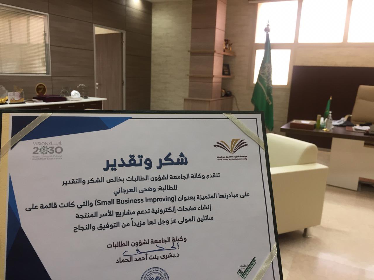 من جانبه كرمت وكيلة الجامعة لشؤون الطالبات فريق نادي الطلبة المطورين والمشاركين في بادرة (تحسين الأعمال الصغيرة) والتي لاقت قبولا واسعاً وإستحساناً من جميع المستفيدين منها تضمنت المبادرة على تقديم خدمة إنشاء موقع إلكتروني على شبكة الإنترنت لكي تدعم وتشجع وتخدم مشاريع وعمل الأسر المنتجة جعلت منها مبادرة ناجحة ساهمت في علاج الصعوبات وتيسير عمل الأسر المنتجة لتسويق منتجاتها في ضوء الأحكام والشروط ودعماً كبيرا لها ولمنتجاتها لكي تكون عناصر فاعلة ومنتجة في المجتمع إضافة إلى تفعيل دور التجارة الإلكترونية من خلال استخدام الانترنت والوسائل التقنية الحديثة في تسويق ومبيعات المنتجات إلكترونياً ، والبحث عن آليات جديدة تخدم الصناعة المحلية حيث أصبحت التجارة الإلكترونية في وقتنا الراهن رافداً مهماً من روافد الاقتصاد في كل دولة من دول العام إضافة إلى فتح نافذة جديدة لهم ولعملاء جدد غير العملاء التقليديين أو كما يسمى في التجارة الإلكترونية بالعملاء الافتراضيين حيث عمل أعضاء النادي والذي يضم نخبة مميزة من الطالبات خلال الفترة الماضية على إعداد وتأسيس قاعدة بيانات شاملة وكاملة عن تلك الأسر وعناوينها ومنتجاتها وطرق الاتصال بها بعد تسجيلها وذلك لتمكينها من البيع الإلكتروني والذي أصبح وسيلة تسويق حديثة وفعالة إضافة لإستغلال الشبكة العنكبوتية الانترنت كأداة تجارية وتسويقية حديثة لخدمة منتجات الأسر المنتجة المستفيدة من هذه البادرة المحلية (تحسين الأعمال الصغيرة) وزيادة انتشارها.