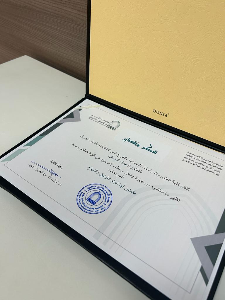يطيب لسعادة وكيلة كلية العلوم والدراسات الإنسانية بالخرج الدكتورة نوال عبد العزيز الفهيد أن تتقدم بالشكر والامتنان للدكتورة منال الدويش مشرفة وحدة الخريجات، والدكتورة فتحية الحكمي مشرفة وحدة العمل الطلابي،