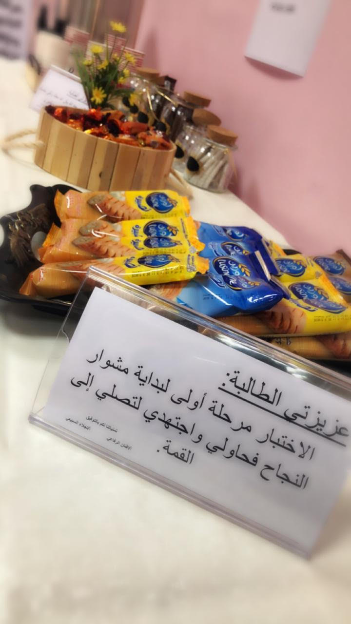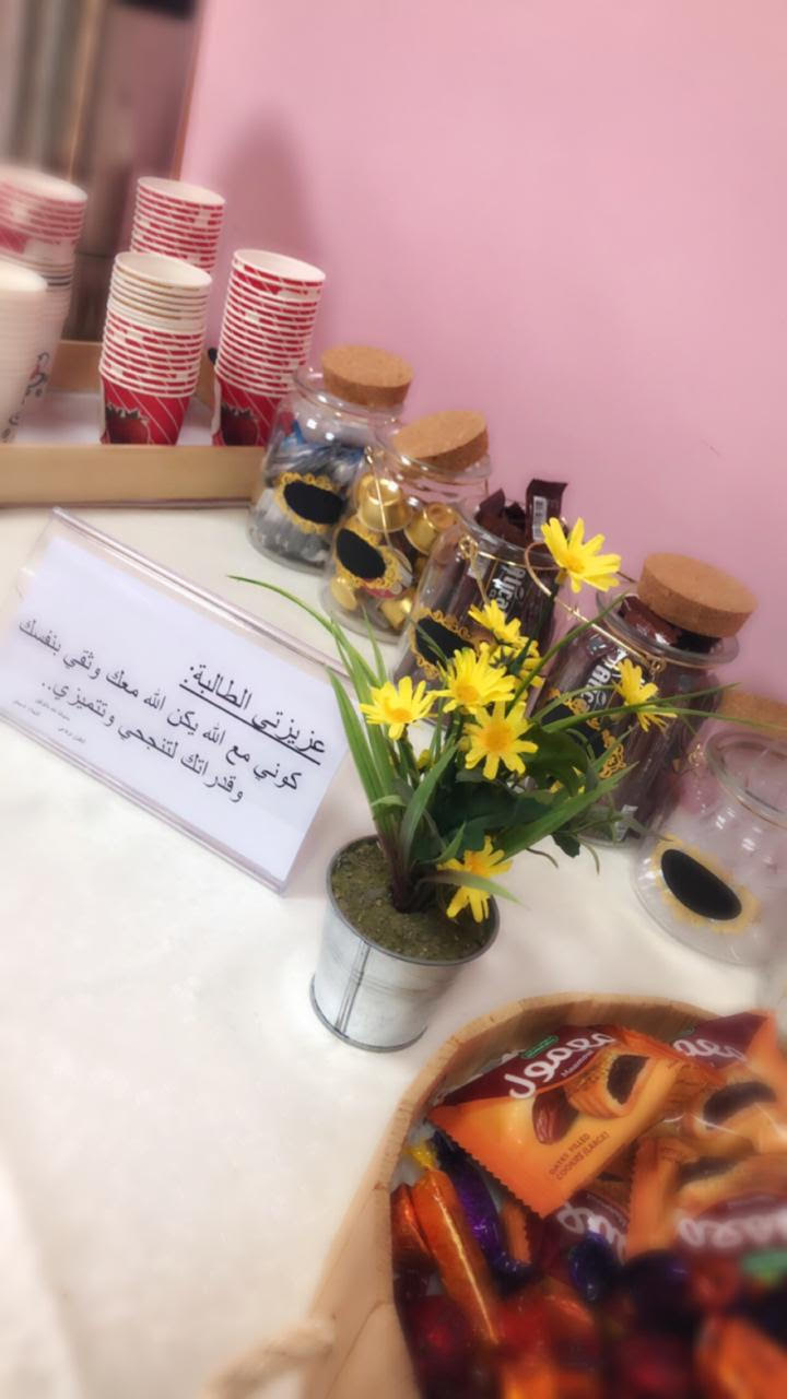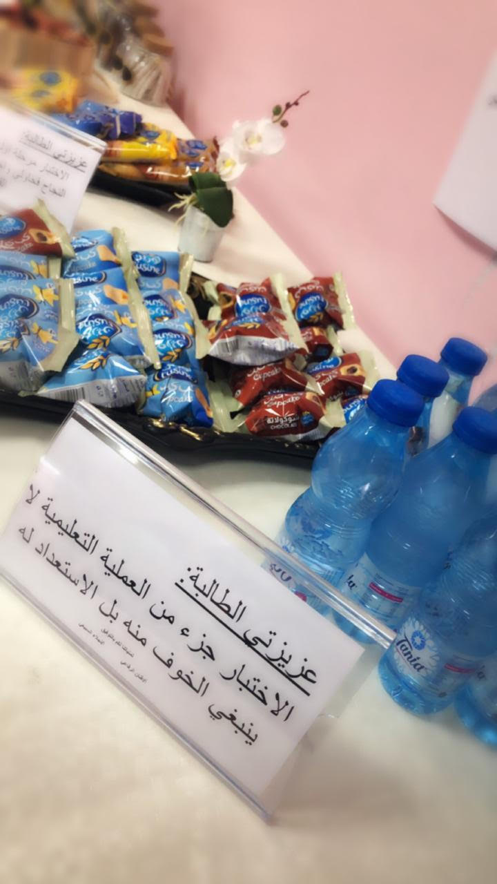 كما بادرت كلا من أ/أفنان الرفاعي أ /نجلاء السبيعي بعمل ركن لتهيئة الطالبات قبل دخول الاختبار وذلك لكسر الرهبة من الامتحان ..