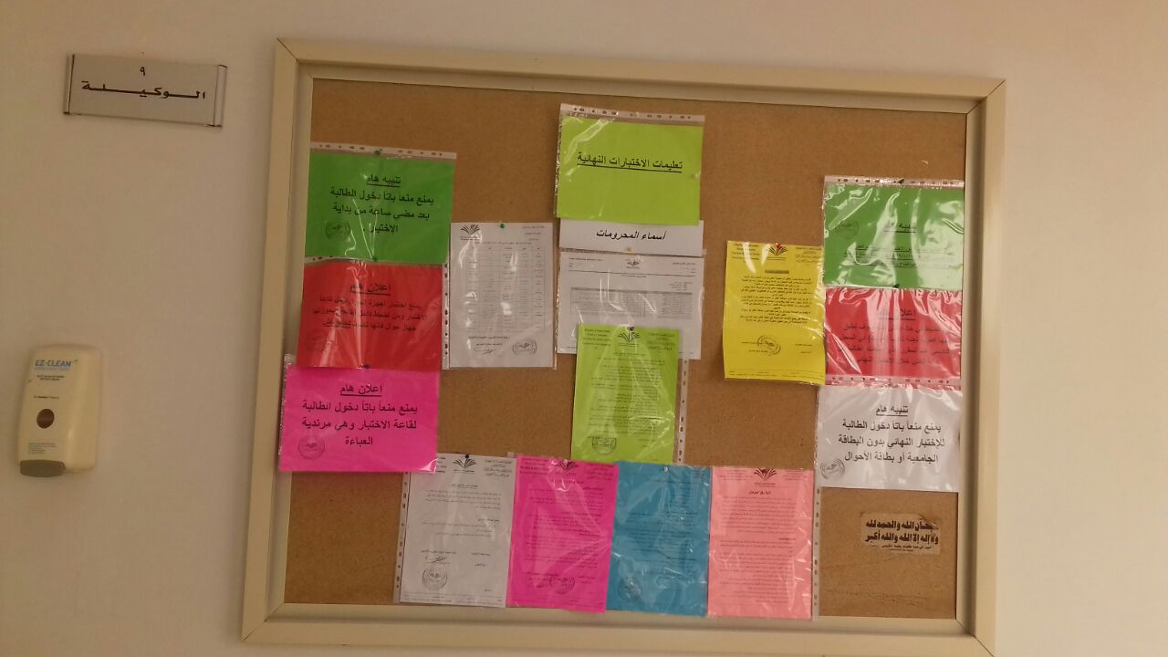 نظراً لما تشكله مرحلة الإختبارات النهائية من أهمية لحياة الطالبة الجامعية قامت الدكتورة أمل بنت صالح الشمراني وكيلة عمادة السنة التحضيرية للطالبات بعدة جولات تفقدية خلال أيام الإختبارات لمتابعة تنظيم القاعات وتجهيزها لتتناسب مع جو الاختبارات لضمان أداء الطالبات لاختباراتهن في هدوء يحقق لهن التفوق المنشود.