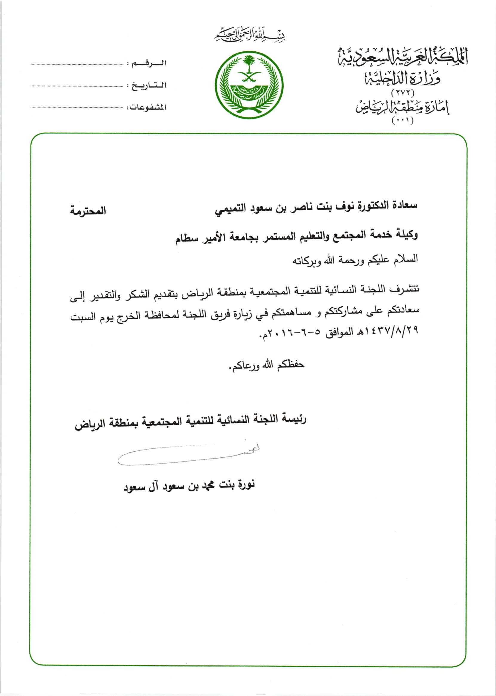 تلقت وكيلة عمادة خدمة المجتمع والتعليم المستمر بجامعة الأمير سطام بن عبدالعزيز بالخرج الدكتورة نوف بنت ناصر التميمي خطاب شكر وتقدير من إمارة منطقة الرياض متمثلة في رئيسة اللجنة النسائية للتنمية المجتمعية صاحبة السمو حرم أمير منطقة الرياض الأميرة نورة بنت محمد بن سعود آل سعود, على مشاركة ومساهمة العمادة في زيارة فريق اللجنة لمحافظة الخرج.