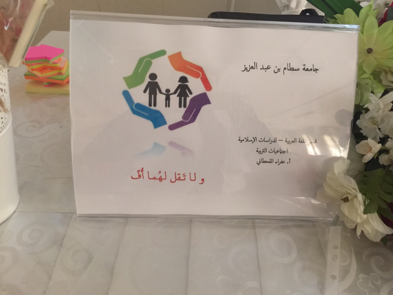 انطلقت حملة ( ولا تقل لهما أف ) يوم الاحد 1436/6/23 هـ بالمدرسة الثانوية السادسة بالدلم والتي ينظمها ويشرف عليها قسم العلوم التربوية تعزيزا ً لمبدأ الشراكة بين الكلية والتعليم العام وتهدف الحملة الى خدمة المجتمع المحلي عن طريق نشر التوعية بترسيخ مفهوم البر بالوالدين والرفق بهما والتحذير من الالفاظ التى تسبق اللسان دون التفكير وتعويد الطالبات على التواضع مع الوالدين وغرس قيمة مصاحبة الوالدين في الدنيا بالمعروف .