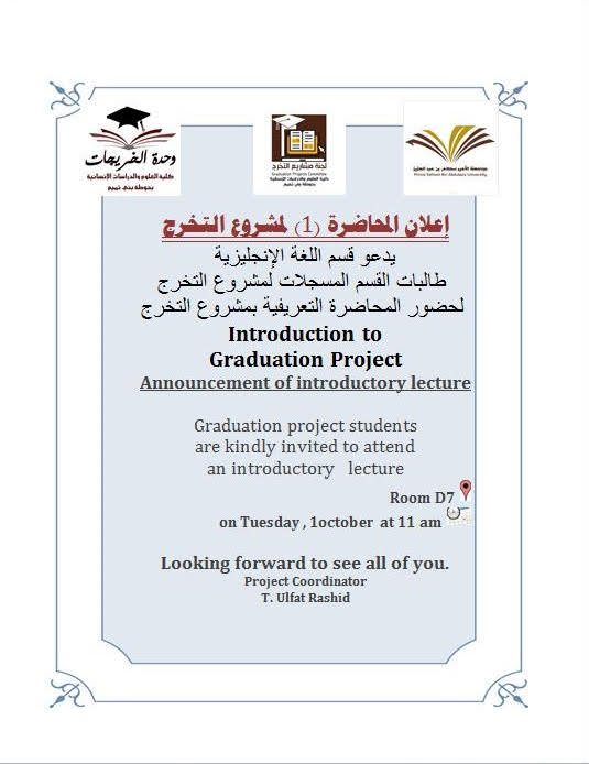 كما قدمت أ. نازرين حسين المحاضر و منسقة مشاريع التخرج بقسم نظم المعلومات (المحاضرة الأولى لتهيئة طالبات المستوى السادس بقسم نظم المعلومات لمشروع التخرج1) يوم الأربعاء الموافق 1441/2/3هـ بقاعة (A(1-9 بحضور (26) طالبة. بدأت المحاضرة باستعراض مراحل إعداد مشروع التخرج1 و الغاية من تنفيذه ، كما أوضحت للطالبات الفرق بين مشروع التخرج1 و مشروع التخرج2 بالتطبيق على محتوى مشروع تخرج1 مع بعض الإرشادات اشتملت محتوى كل فصل في التقرير و القواعد اللازم اتباعها في كلا النسختين الورقية و الإلكترونية للمشروع إضافة إلى كيفية التقييم. واختتمت المحاضرة بالرد على استفسارات الطالبات و متابعة أدائهن في المشروع.