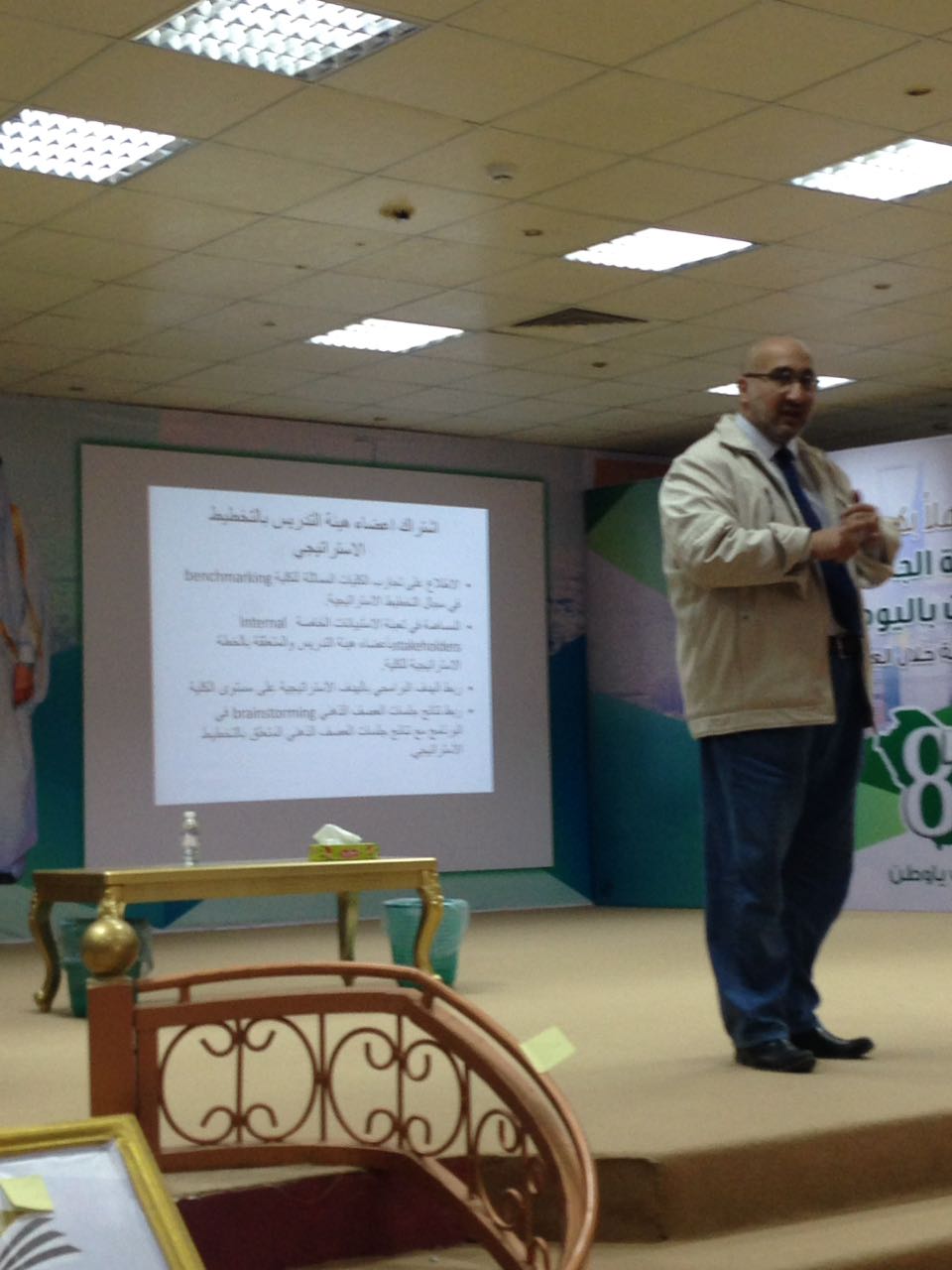 وبين الزعبي ضرورة تحليل الوضع الراهن للمؤسسة باستخدام تحليل سوات SWOT وتحليل الفجوة Gap Analysis وبين د.عصام خطاب ضرورة مشاركة أعضاء هيئة التدريس في الخطة الإستراتيجية للكلية من خلال محاور أساسية وهي :