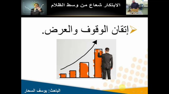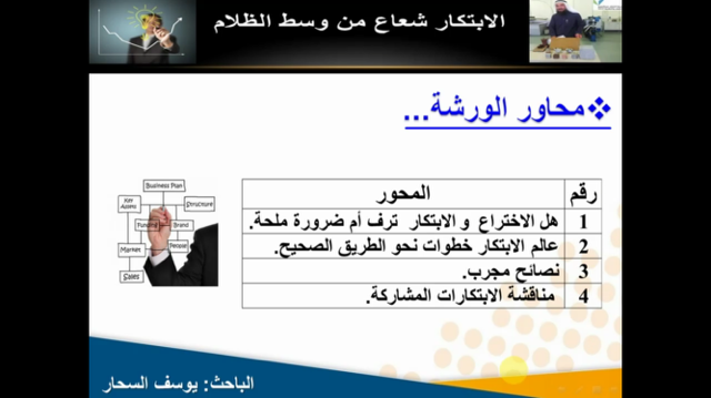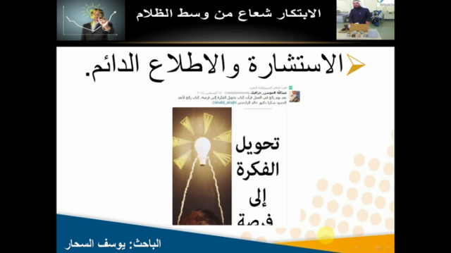 نظمت عمادة شؤون الطلاب ،أمانة المؤتمر العلمي عبر البث المباشر بكلية العلوم والدراسات الإنسانية بالأفلاج اليوم الأربعاء 1437/5/19 هـ الساعة التاسعة صباحاً ضمن فعاليات المؤتمر العلمي السابع ورشة عمل بعنوان ( الإبتكارات أفكار وإبداعات ) , قدمها الباحث يوسف السحار, افتتحها بتعريف الابتكار و ماهيته ووصفه بأنه شيء لا يمكن الإكتفاء منه و إنما يطلب الجديد منه , و ذكر أيضاً أن الإبتكار لا يقتصر على الموهوبين , بعد ذلك تطرق لمحاور الورشة , ثم ارفق عدة نصائح تفيد المبتكرين , تلى ذلك ذكر نماذج لبعض الابتكارات مع أسماء مبتكريها , بعدها عرض سيرة عن مبتكراته , وفي ختام الورشة أجاب عن أسئلة واستفسارات الحضور , استهدفت شريحة الطالبات , حيث هدفت إلى صقل قدرات الطلاب والطالبات ورفع مستواهم العلمي .