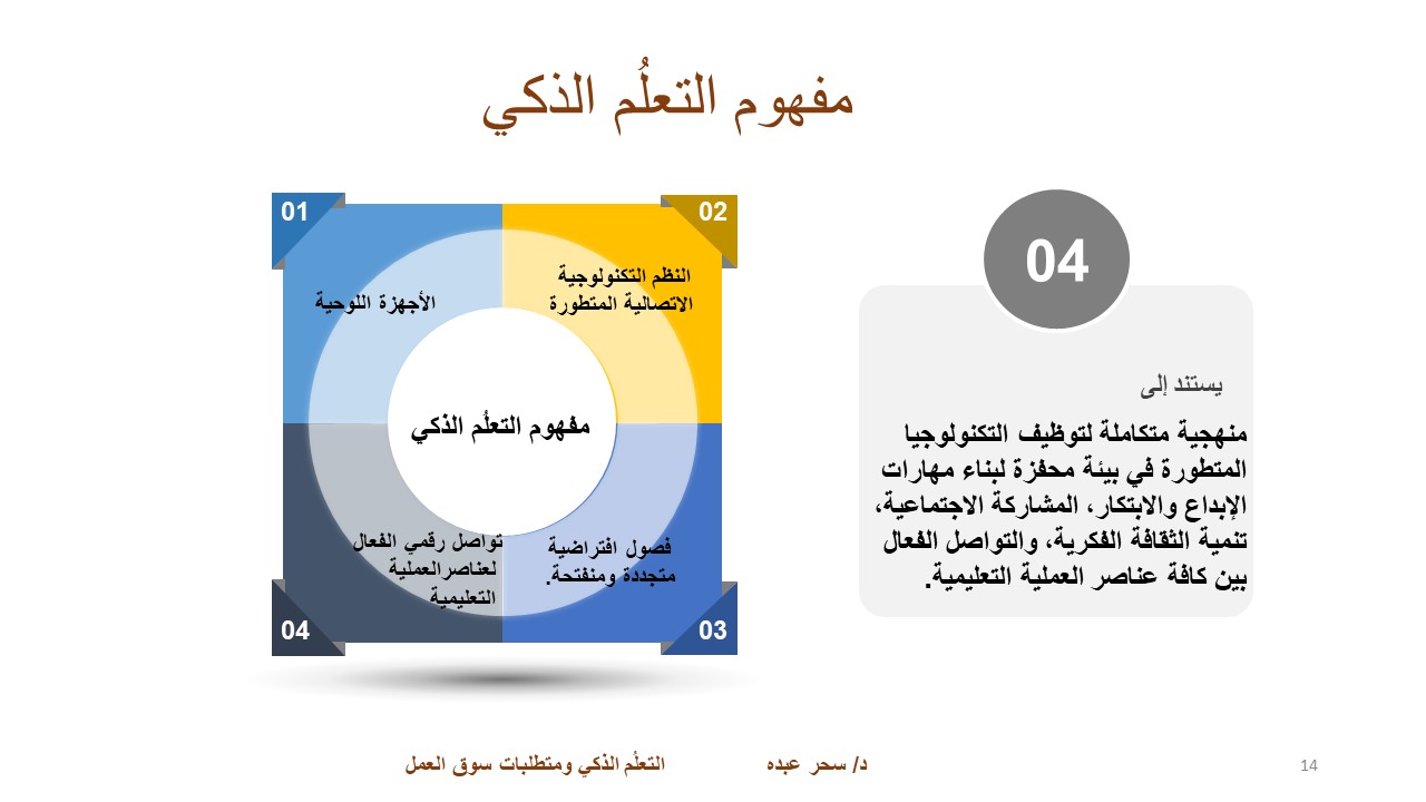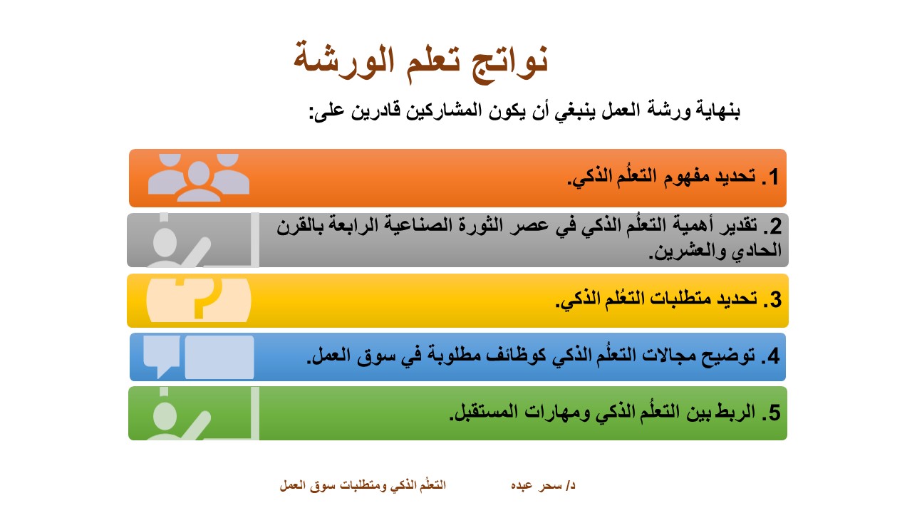 استهلت الورشة بتقرير مستقبل الوظائف 2020 بالمنتدى الاقتصادي العالمي، حيث أن القرن الحادي والعشرين يشهد توجهات حديثة في التعلُم الذكي لأن بيئة