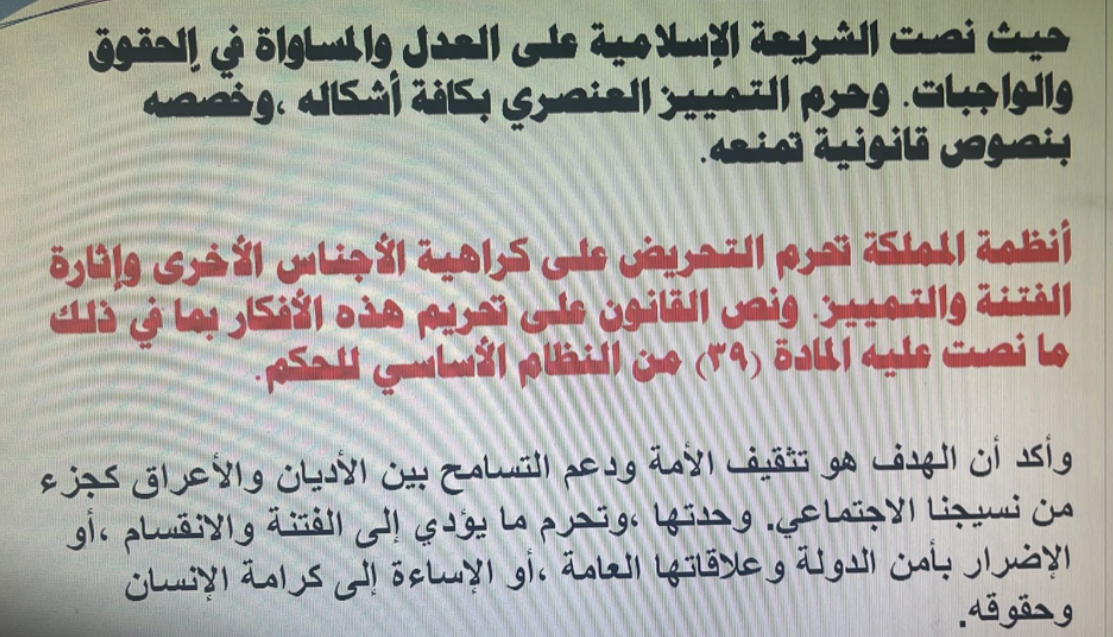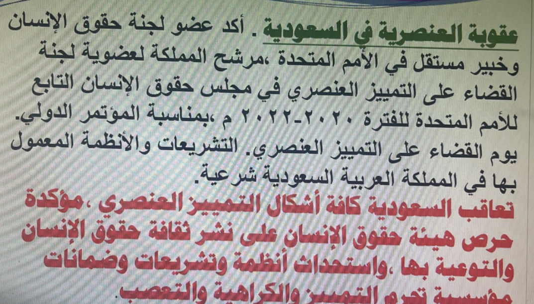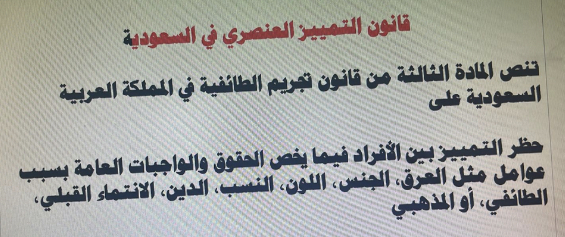 نص القانون السعودي على حظر التمييز العنصري في المملكة حظر وتحريم التمييز العنصري لما يؤدي إليه من الكراهية والحقد بين الأفراد مما يؤثر علي أمن المجتمع.