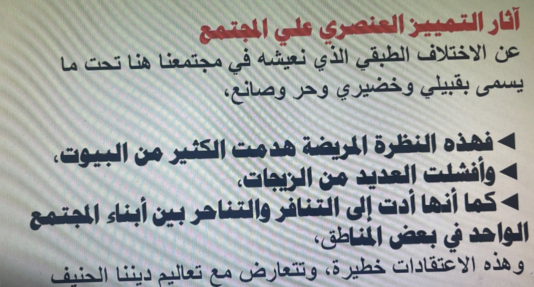 وقد تم مناقشة الطالبات في الأثار السلبية للتمييز العنصري على أفراد المجتمع وقد أبدين اعجابهن بالموضوع والعرض وطالبن بالمزيد من نوعية هذه الموضوعات لما لها من أهمية بالغة على أمن وسلامة المجتمع السعودي.