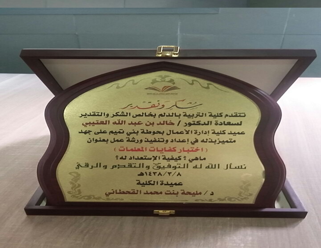 وفي الختام قدمت الكلية ممثلة في عميدتها د.مليحة القحطاني شكرها وتقديرها للدكتور خالد العتيبي ،على استجابته للدعوة وتفعيل الورشة بالكلية .