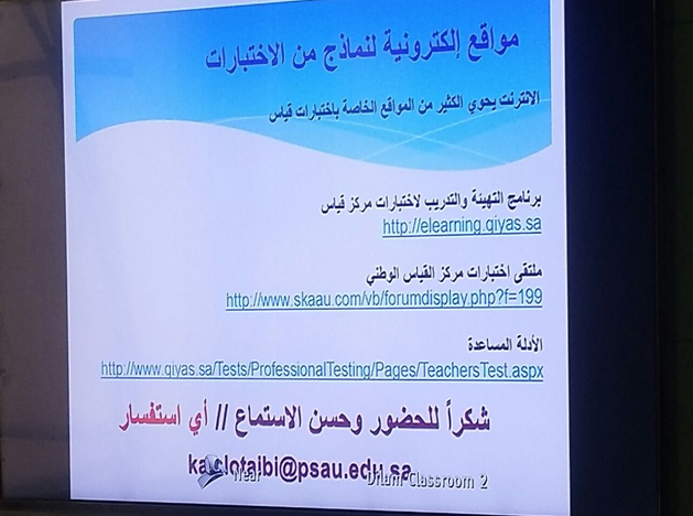 حيث دعا الخريجات للاستفادة من الخدمات التي يقدمها موقع مركز قياس والفائدة العظيمة التي تعود على الخريجة؛ بحيث تمكنها الخدمات من خوض الاختبارات بكل يسر وسهولة، بعد ذلك تم عرض نماذج من الاختبارات لجميع التخصصات التعليمية بالإضافة إلى نماذج للاختبارات العامة التي تشمل جميع التخصصات، و الاستراتيجيات الحديثة المستخدمة في المركز الوطني للقياس والتقويم في كافة هذه التخصصات.