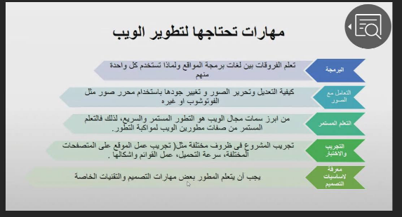 التعرف على أساسيات المهارات الأساسية التي يجب أن يتعلمها مصممو المواقع المبتدئين، تطويرها، أنواعها (الديناميكية والثابتة)، خطوات تصميمها، أهم لغات البرمجة المستخدمة فيها وأهم أنظمة إدارة المحتوى وكيفية تشغيلها.