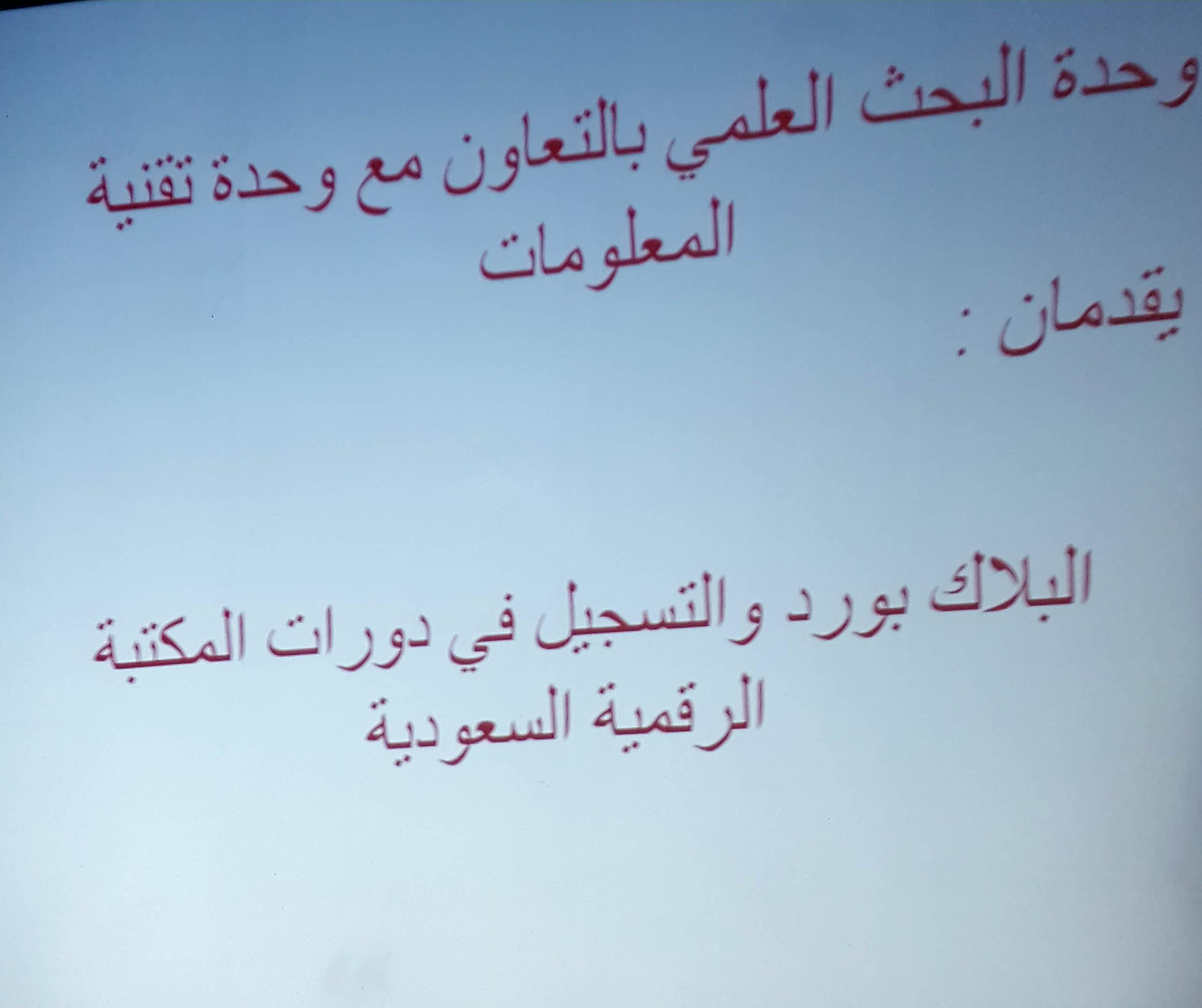 بتوجيه من الأستاذ الدكتور عبد الله الفالح عميد الكلية ، وإشراف دكتورة سهير الباز وكيلة الكلية نظمت وحدة البحث العلمي بالتعاون مع وحدة تقنية المعلومات ورشة عمل بعنوان ( استخدام البلاك بورد في التسجيل بدورات المكتبة الرقمية السعودية) قدمتها أستاذة إنصاف بشير الصديق وذلك يوم الأحد الموافق 23/2/ 1439هـ بمسرح الكلية ، نسق الورشة وأشرف عليها د. ناهد محمد عثمان منسقة البحث العلمي ، وحضرها سعادة الدكتورة وكيلة الكلية وعضوات هيئة التدريس .