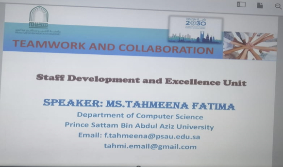 قدمت وحدة التطوير والجودة ممثلة في وحدة التطوير والتمييز العلمي بكلية الآداب والعلوم بالتعاون مع قسم الحاسب الألي ممثل في الدكتورة: تهمينة فاطمة شيخ عبد الكريم المحاضر بالقسم حول "العمل الجماعي والتعاون" وذلك يوم الخميس الموافق 2023/10/12