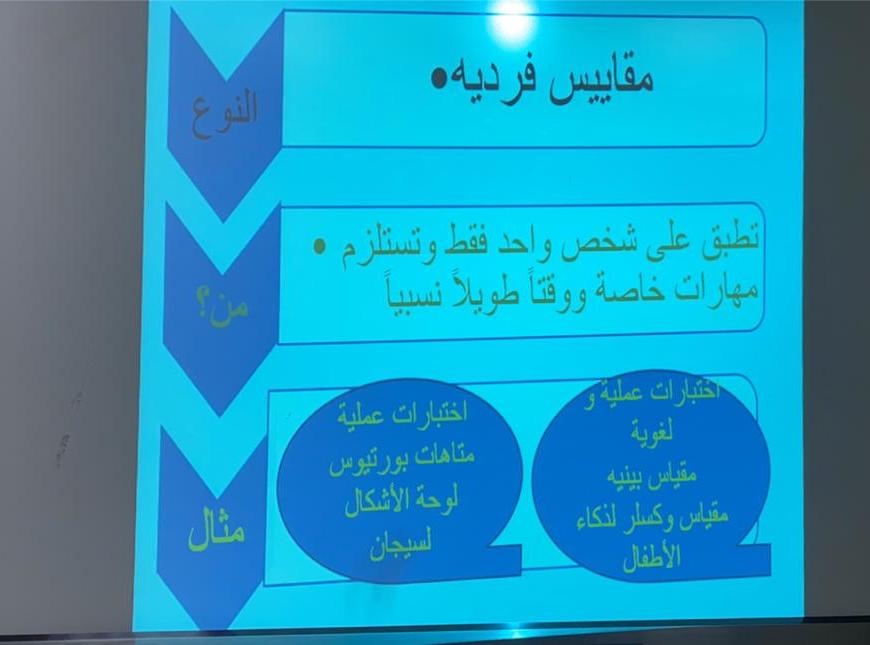 أقامت وحدة العمل الطلابي بكلية التربية بالخرج ممثلة بقسم التربية الخاصة ورشة بعنوان (المقاييس النفسية) لقياس الإضطرابات النفسية لدى الأطفال , للدكتورة / أفراح باقازي .وذلك في يوم الأحد الموافق 13-7-1441هـ, بقاعة التدريب وقد هدفت الورشة لتعريف الطالبات بالمقاييس النفسية مثل مقاييس الذكاء و مقاييس الشخصية و مقاييس الإضطرابات السلوكية و مقاييس التشخيص الأكاديمية و العقلية .