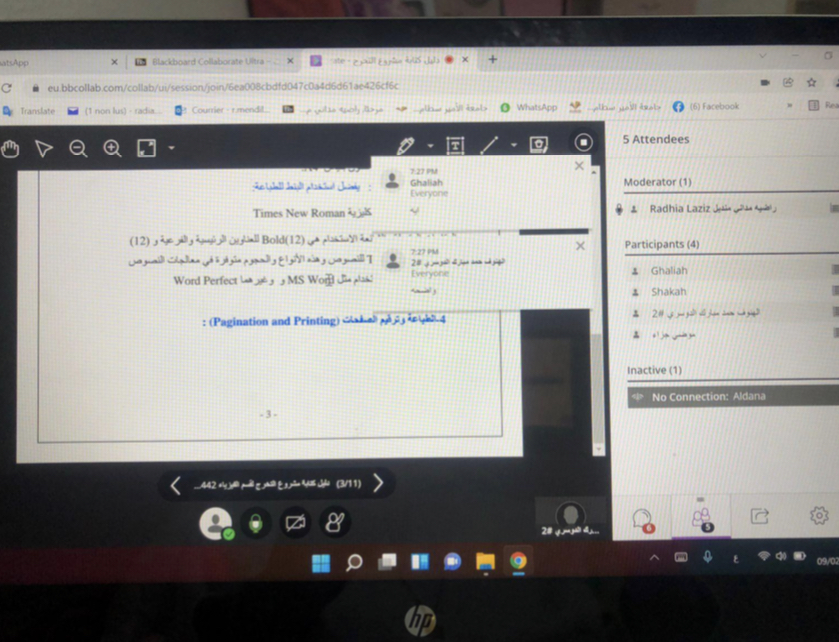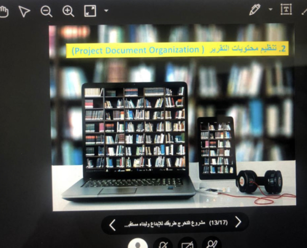 منديل منسقة لجنة مشاريع التخرج بالكلية وذلك يوم الأربعاء الموافق 2022/02/09 م الساعة السابعة مساء والتي تهدف إلى تهيئة الطالبات المتوقع تخرجهن لسنة الامتياز من خلال تدريبهم على