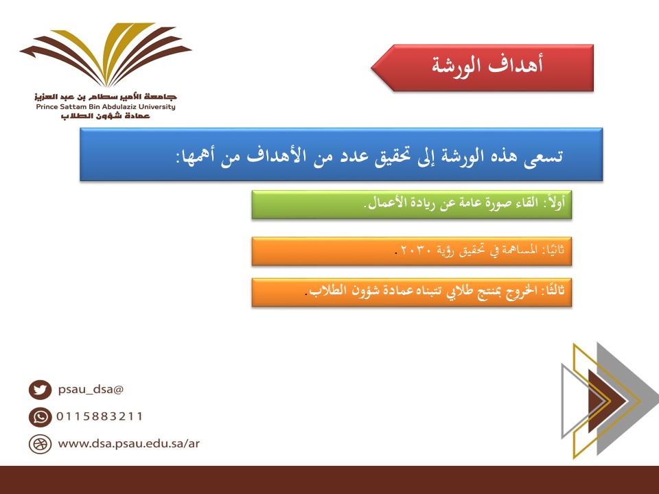 من منطلق اهتمام المملكة البالغ بالاستثمار في عقول الشباب وأفكارهم الابداعية ,ودعمها القطاعات المختلفة لإنشاء شباب واعٍ، وكوادر مُطلعة على أهم أسس الفكر الإبداعي ,وإيماناﹰ من وزارة التعليم بأهمية بناء منظومة وطنية متكاملة ومستديمة داعمة لريادة الأعمال وسعياً من الجامعة لدعم التنويع الاقتصادي والمساهمة فيه من خلال تطوير مهارات الطلاب و الطالبات في مجال ريادة الأعمال وإنشاء المشاريع الاستثمارية التجارية، نظمت وحدة العمل الطلابي بكلية التربية بوادي الدواسر ورشة عمل بعنوان (فن ريادة الأعمال) يوم الثلاثاء الموافق 1441/6/24هـ قدمتها د/أمل صابر سعيد الأستاذ المساعد بقسم الاقتصاد المنزلي وذلك في إطار البرنامج التدريبي التأهيلي للملتقى العلمي الطلابي "كونى في الصدارة" الداعم لترسيخ ثقافة العمل الحر والمساهمة في استثمار التخصصات المتنوعة للطالبات وتحفيز روح المبادرة لديهن لزيادة كفاءتهن وتمكينهن من تحقيق أهدافهن, لمواكبة أهداف رؤية 2030، والتي تؤكد دور الشباب السعودي في التنمية والازدهار الاقتصادي من خلال المشروعات المتوسطة والصغيرة .