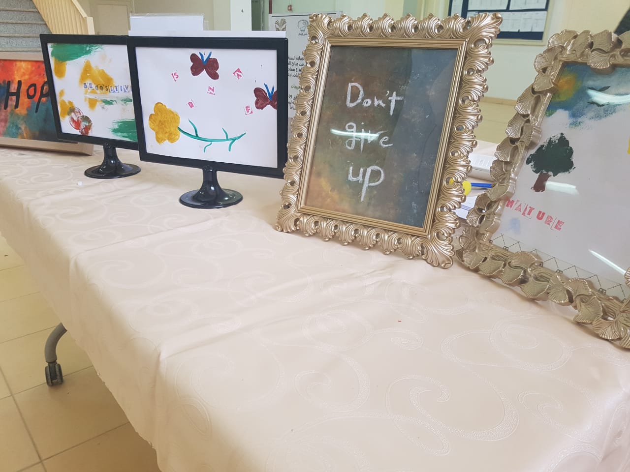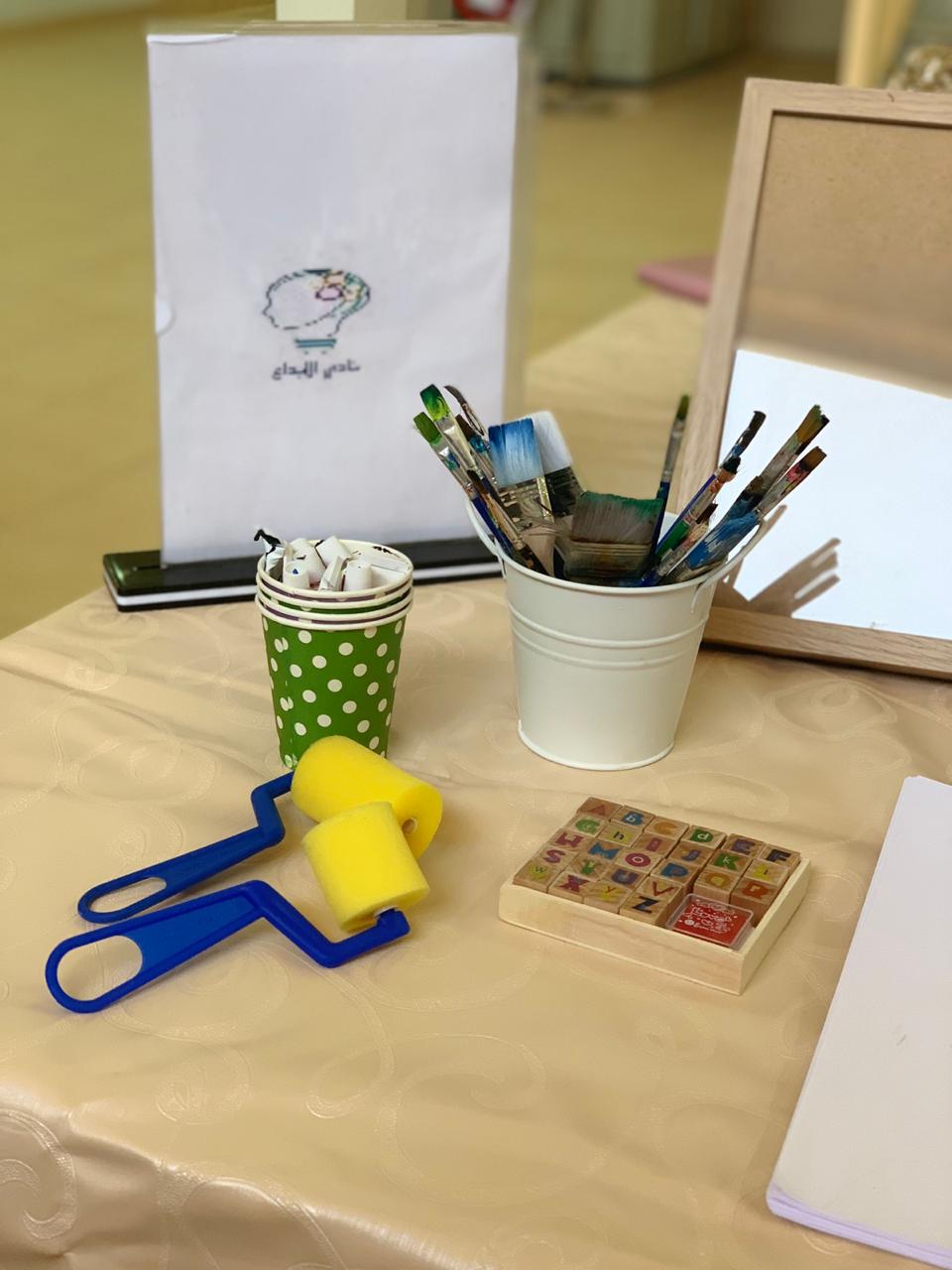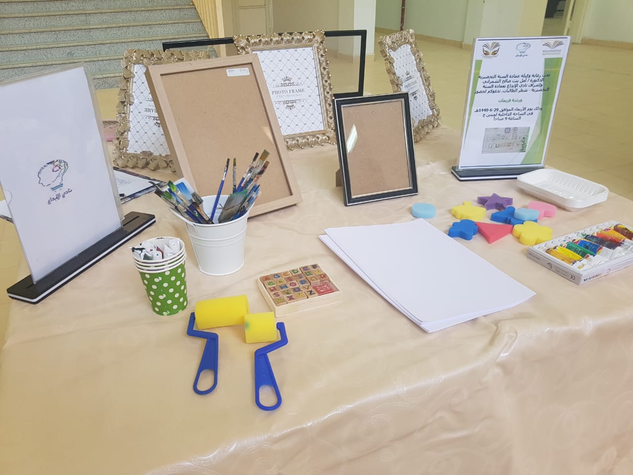استغلالاً لمواهب الطالبات وتنمية لمهاراتهن وصقلها واكسابهن خبرات جديدة فقد نظمت طالبات نادي الابداع في بهو عمادة السنة التحضيرية – شطر الطالبات ورشة فنية بعنوان "فريمات" والتي هي عبارة عن إطارات خشبية متنوعة الأشكال والأحجام والألوان جُسد فيها أعمال فنية من إبداعات الطالبات باستخدام الورق وبواسطة الطباعة والتي تمت باستخدام قوالب اعدت خصيصا لهذا النشاط الإبداعي للطالبات ،نُفذت هذه الورشة يوم الأربعاء الموافق 1440/6/29هـ ، بإشراف الأستاذة سهاد الهويدي وقد لاقت استحسان وتشجيع من الحضور الذين شاركوا في هذه الورشة.