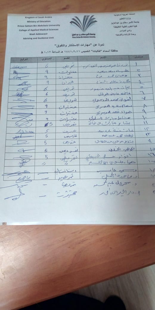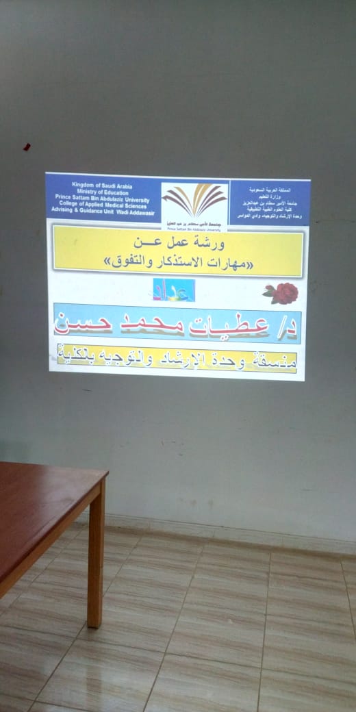 بمناسبة اقتراب الامتحانات الفصلية بالكلية العلوم الطبية التطبيقية بوادي الدواسر أقامت وحدة الارشاد والتوجيه بالكلية يوم الخميس ١٤٤١/٢/١١ بمسرح الكلية ورشة عمل تحت عنوان (مهارات الاستذكار والتفوق) قدمتها دكتورة عطيات محمد حسن منسقة وحدة الارشاد والتوجيه بالكلية بحضور الطالبات وأعضاء هيئة تدريس بالكلية