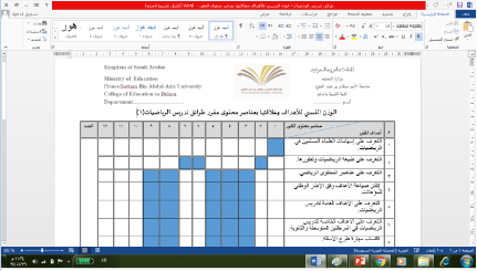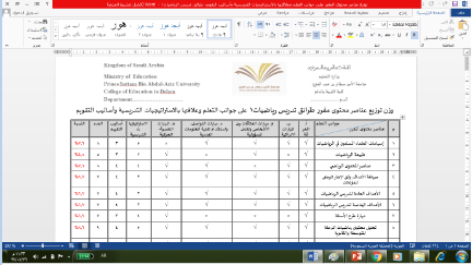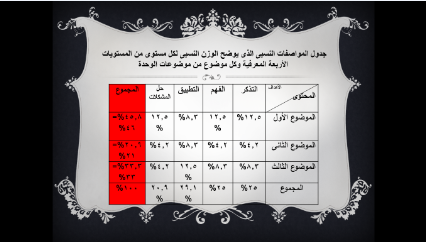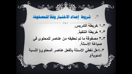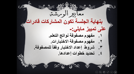 اشتملت الورشة على معايير مهمة منها معرفة مفهوم مصفوفة نواتج التعلم والاختبارات ، وشروط إعداد الاختبار وفقاً للمصفوفة وتحديد خطوات إعدادها ، حيث بدأت الورشة بعرض تقديمي عن مواصفات الاختبار ونواتج التعلم، و مجالات الأهداف، وقد ناقشت د./ سحر عبده من خلال الورشة هذه العناصر و طريقة عملها ، مرفق جداول عن الوزن النسبي لتوزيع فقرات اختبار الفصل الدراسي ، و الوزن النسبي للأهداف (مؤشرات الأداء) وعلاقتها بعناصر محتوى المقرر، و جدول عن توزيع عناصر محتوى المقرر على جوانب التعلم وعلاقتها بالاستراتيجيات التدريسية وأساليب التقويم ، كما تطرقت لشروط إعداد الاختبار وفقاً للمصفوفة ، خريطة التدريس والتنفيذ ، مصفوفة ماتم تحقيقه من عناصر للمحتوى في صياغة الأسئلة ، هل تغطي الأسئلة بالفعل عناصر المحتوي ( النسبة المئوية ) .
